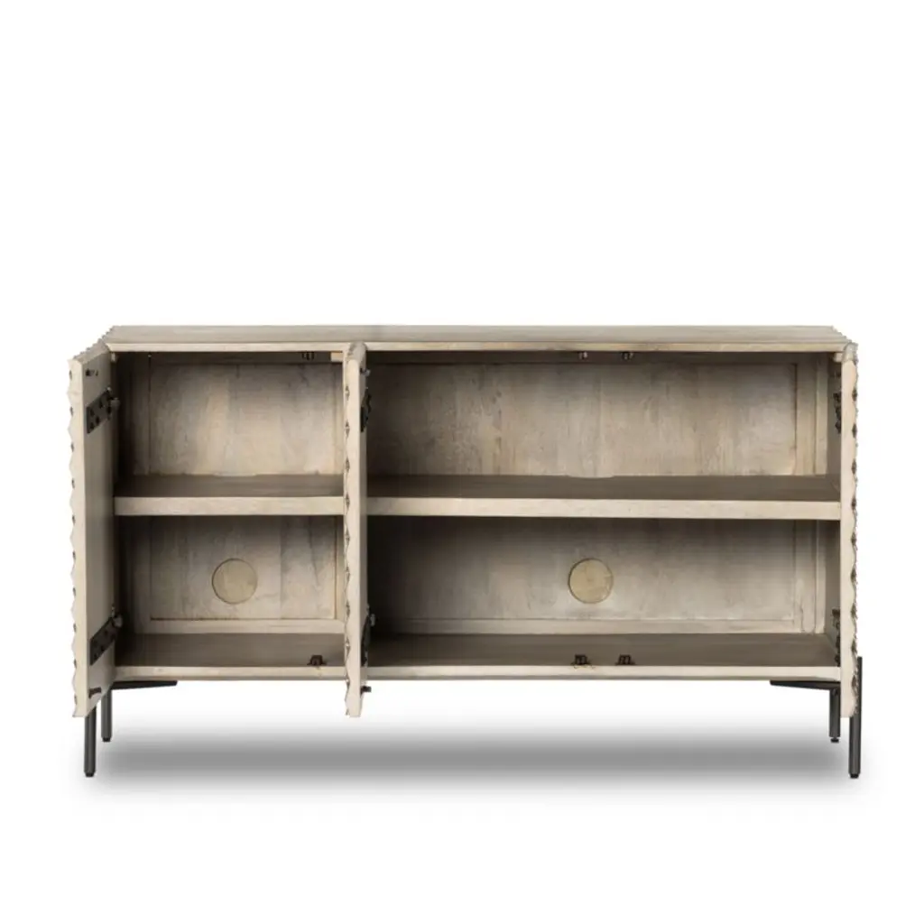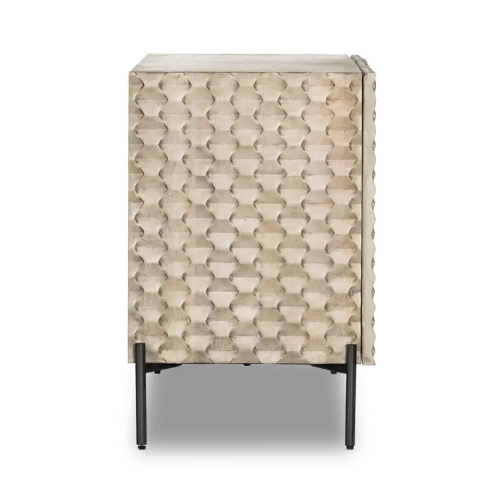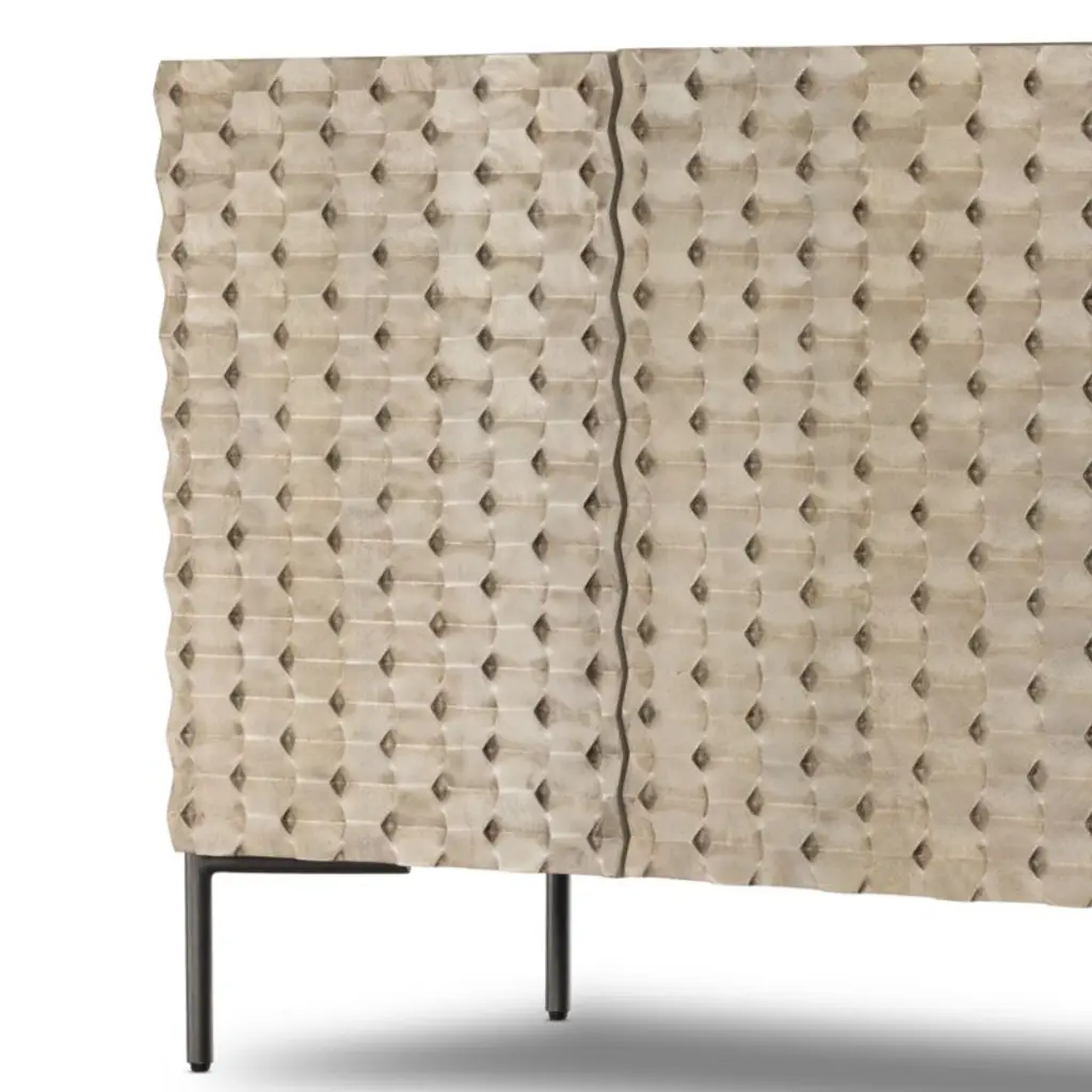A carved honeycomb pattern wraps Raffael's grey-washed exterior in conversation-sparking texture and dimension. Crafted of renewable solid mango wood, from trees no longer producing fruit, each facet of the intricately carved door fronts highlights the wood's lively grain. Set on a minimalist base of gunmetal-finished iron, the small console makes a sculptural addition to a living or family room. Raffael's seamless facade features three doors that open to two fixed shelves that house media components or provide storage.