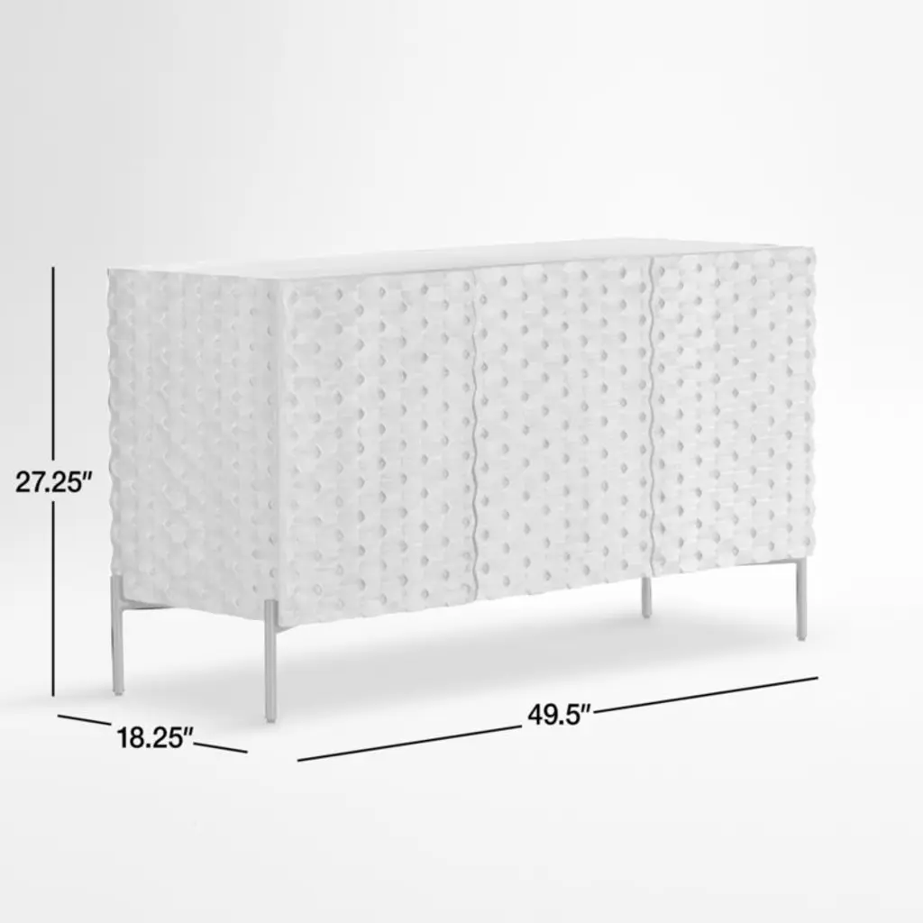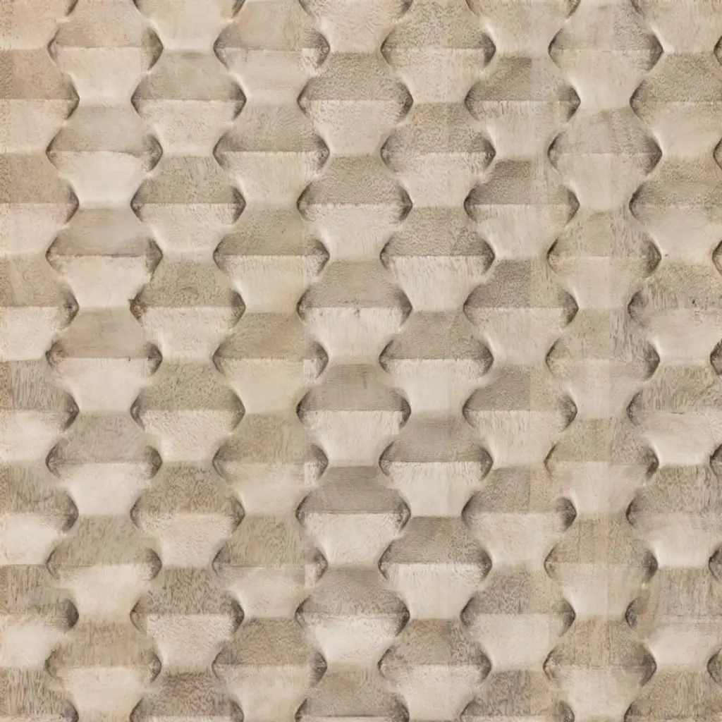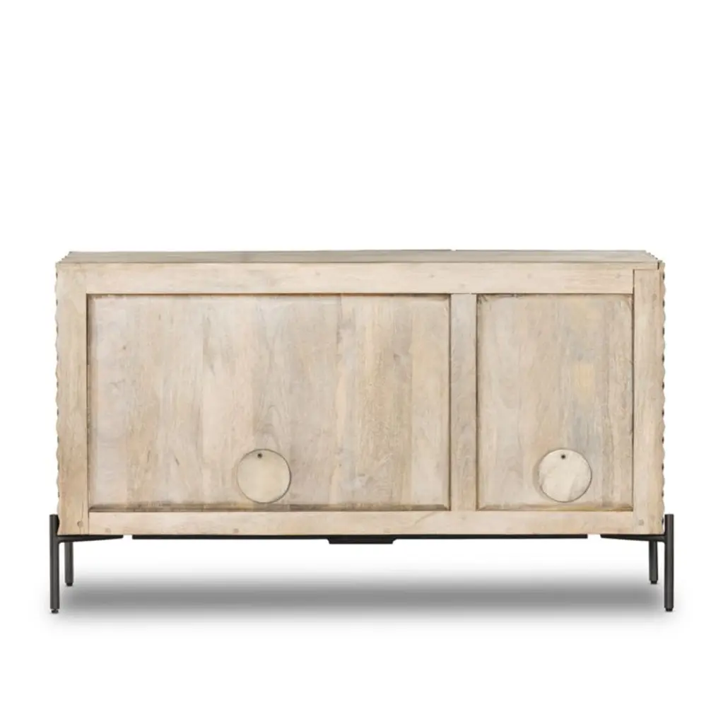 A carved honeycomb pattern wraps Raffael's grey-washed exterior in conversation-sparking texture and dimension. Crafted of renewable solid mango wood, from trees no longer producing fruit, each facet of the intricately carved door fronts highlights the wood's lively grain. Set on a minimalist base of gunmetal-finished iron, the small console makes a sculptural addition to a living or family room. Raffael's seamless facade features three doors that open to two fixed shelves that house media components or provide storage.