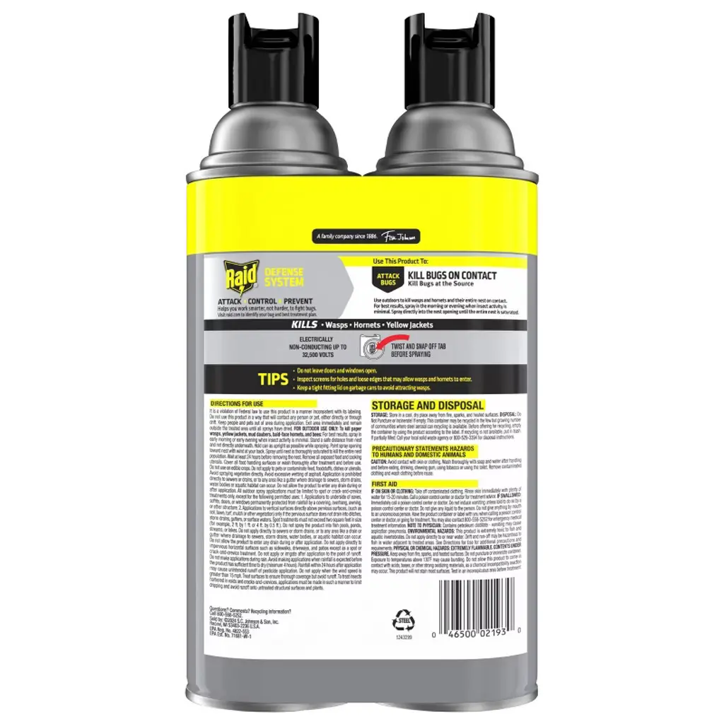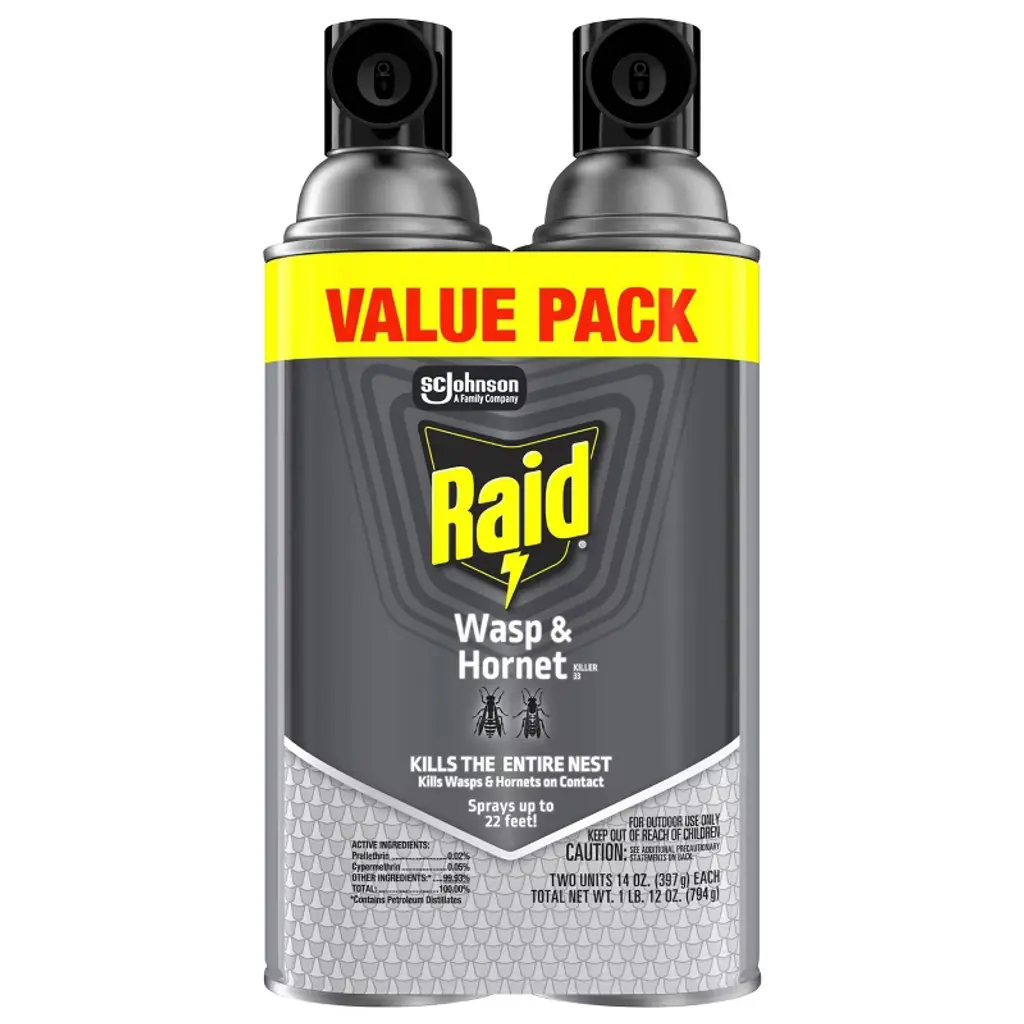 Raid Wasp & Hornet Killer 33 insect spray kills hornets, wasps, yellow jackets and mud daubers on contact and is electrically non-conducting up to 32,500 volts. Our stinging insect killer aerosol sprays up to 22 feet, allowing you to spray from a safe distance.Raid's flying, stinging bug insecticide is effective in killing hornet and wasp nests, too. Just shake well and apply with the wind directly at the nest to remove it. The best time to use this wasp nest spray is early in the morning or early in the evening when activity is minimal around the nest.
