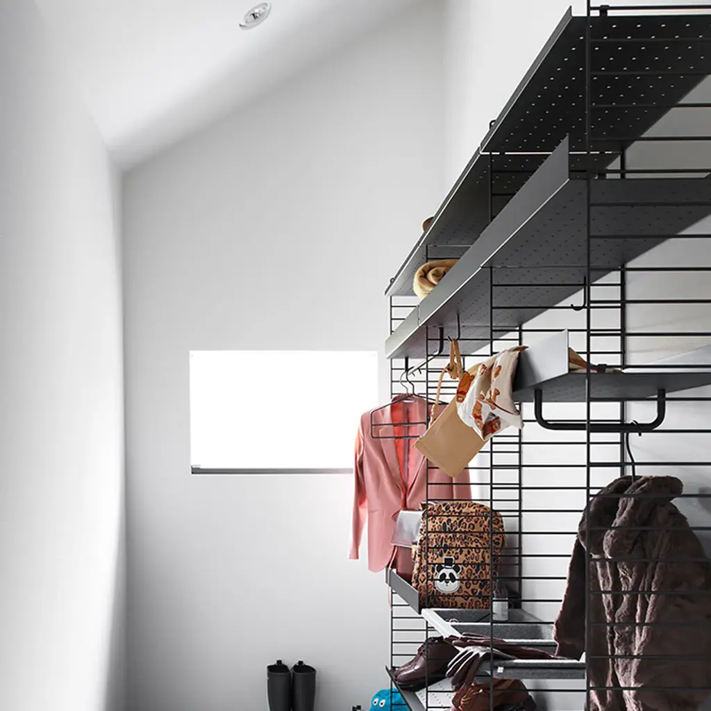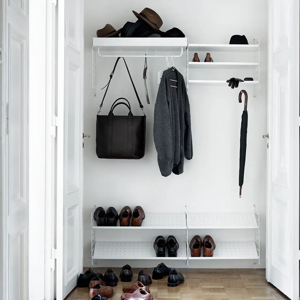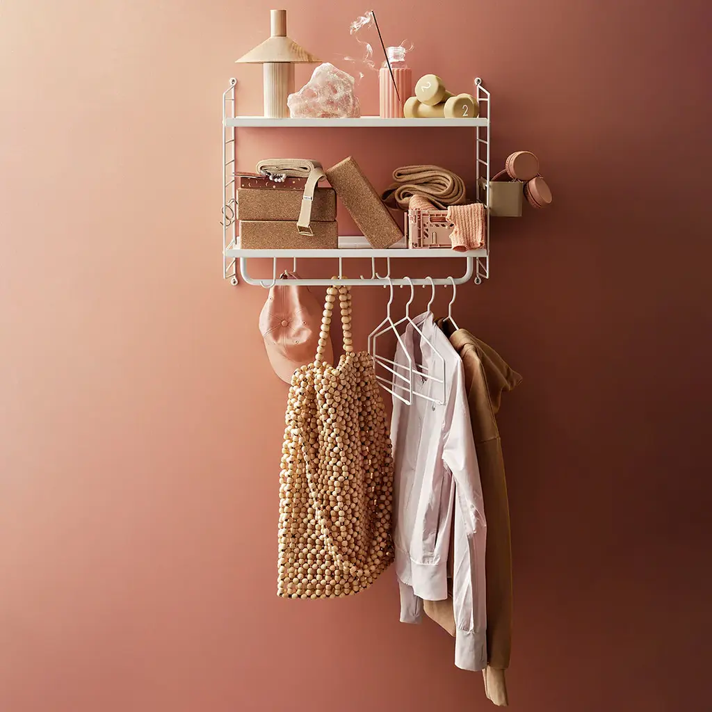 The rods are created to optimize a shelving combination and fit together with metal and galvanized shelves. The rods are available in the following widths: 24 cm, 53 cm, and 72 cm. The rods with widths 53 cm and 72 cm must be mounted along the width of the shelf, whereas the 24 cm wide rod can be mounted along the width or depth, if the shelf has depth 30 cm. The rods increase functionality and makes it possible for even more creative storage solutions. They are the optimal accessory for your hallway or wardrobe shelf since they make is possible to add coat-hangers from String® System. It is also a great spot to hang scarves, shawls or why not the dog leash. Each packaging contains one rod.