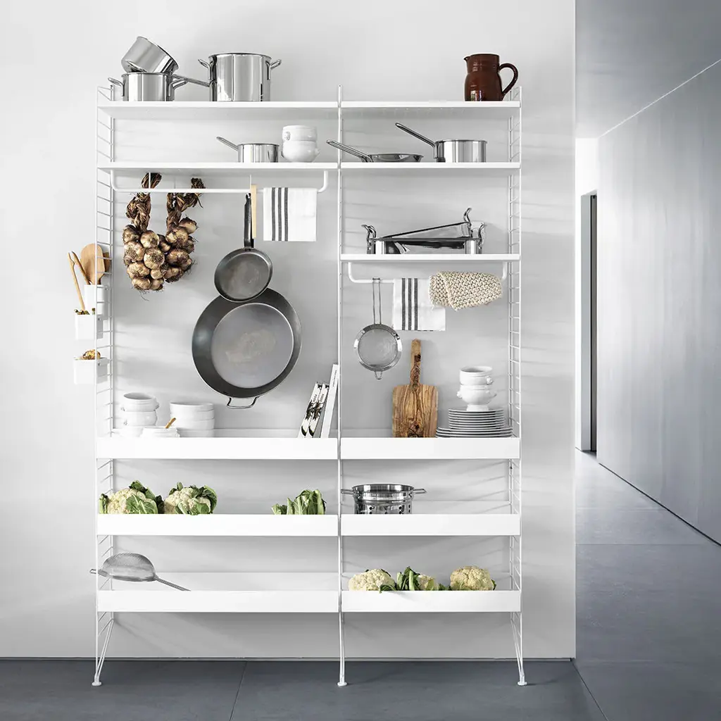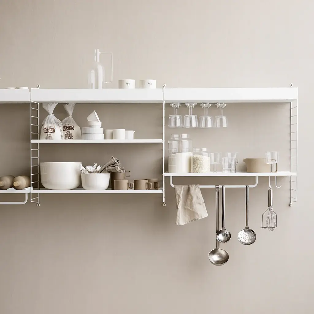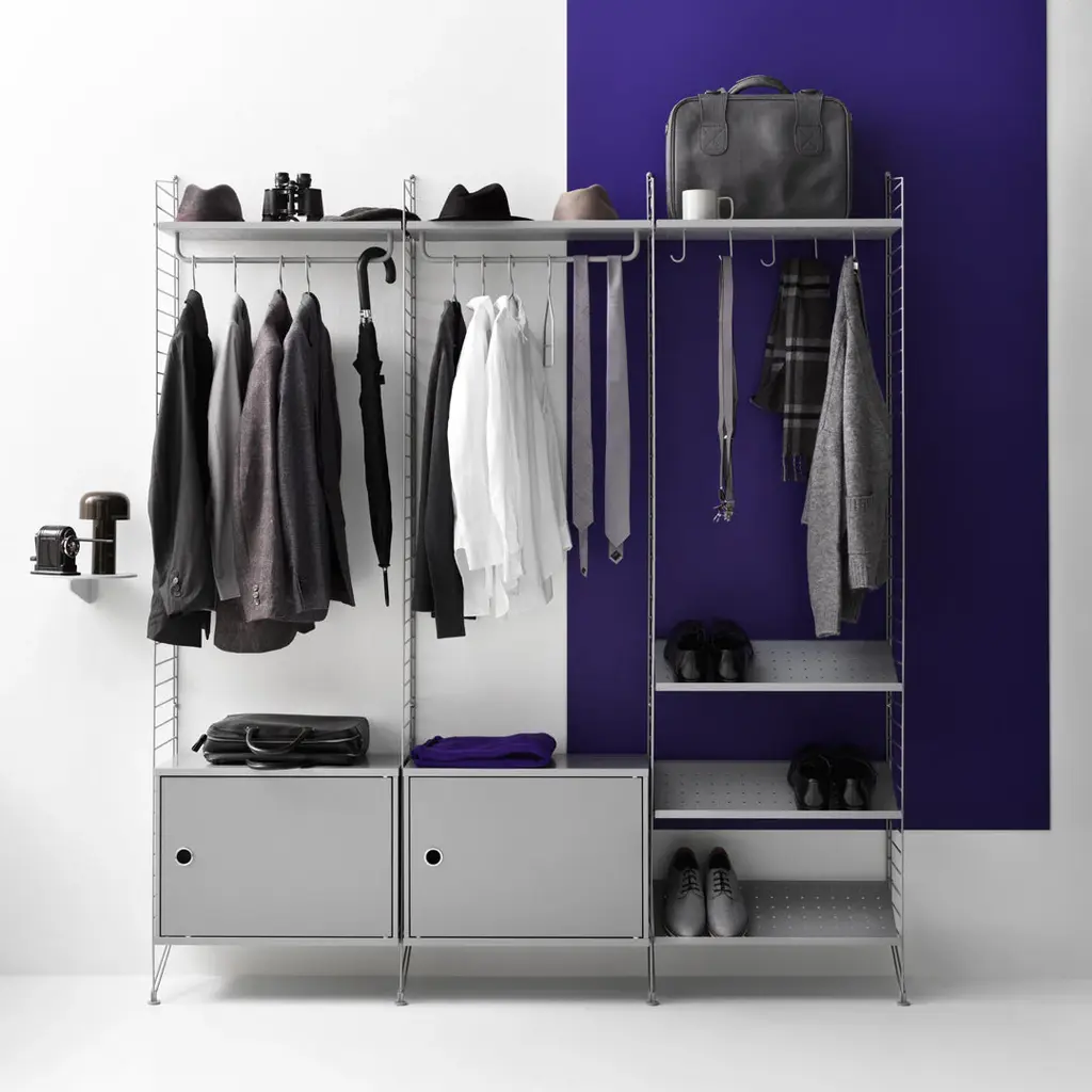 The rods are created to optimize a shelving combination and fit together with metal and galvanized shelves. The rods are available in the following widths: 24 cm, 53 cm, and 72 cm. The rods with widths 53 cm and 72 cm must be mounted along the width of the shelf, whereas the 24 cm wide rod can be mounted along the width or depth, if the shelf has depth 30 cm. The rods increase functionality and makes it possible for even more creative storage solutions. They are the optimal accessory for your hallway or wardrobe shelf since they make is possible to add coat-hangers from String® System. It is also a great spot to hang scarves, shawls or why not the dog leash. Each packaging contains one rod.