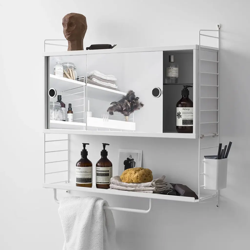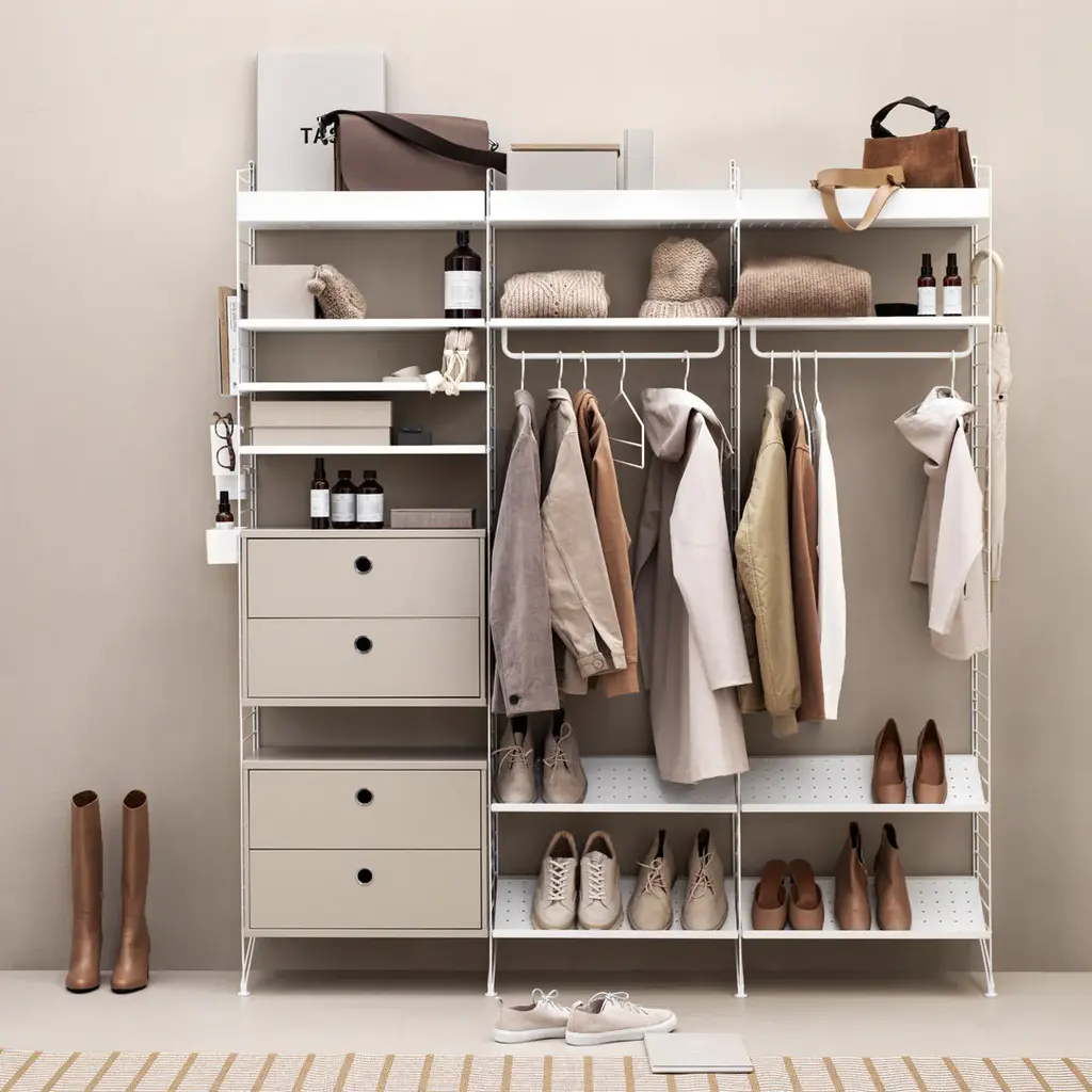 The rods are created to optimize a shelving combination and fit together with metal and galvanized shelves. The rods are available in the following widths: 24 cm, 53 cm, and 72 cm. The rods with widths 53 cm and 72 cm must be mounted along the width of the shelf, whereas the 24 cm wide rod can be mounted along the width or depth, if the shelf has depth 30 cm. The rods increase functionality and makes it possible for even more creative storage solutions. They are the optimal accessory for your hallway or wardrobe shelf since they make is possible to add coat-hangers from String® System. It is also a great spot to hang scarves, shawls or why not the dog leash. Each packaging contains one rod.