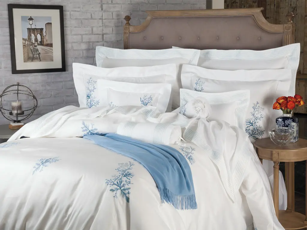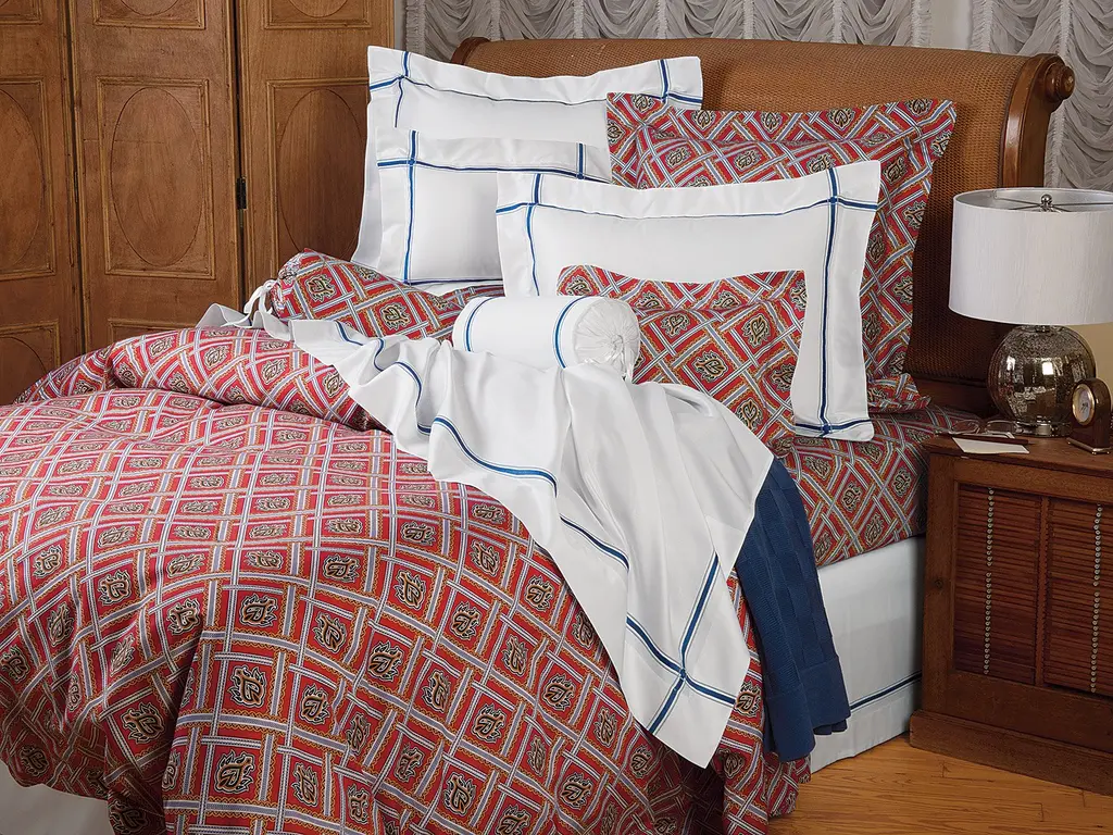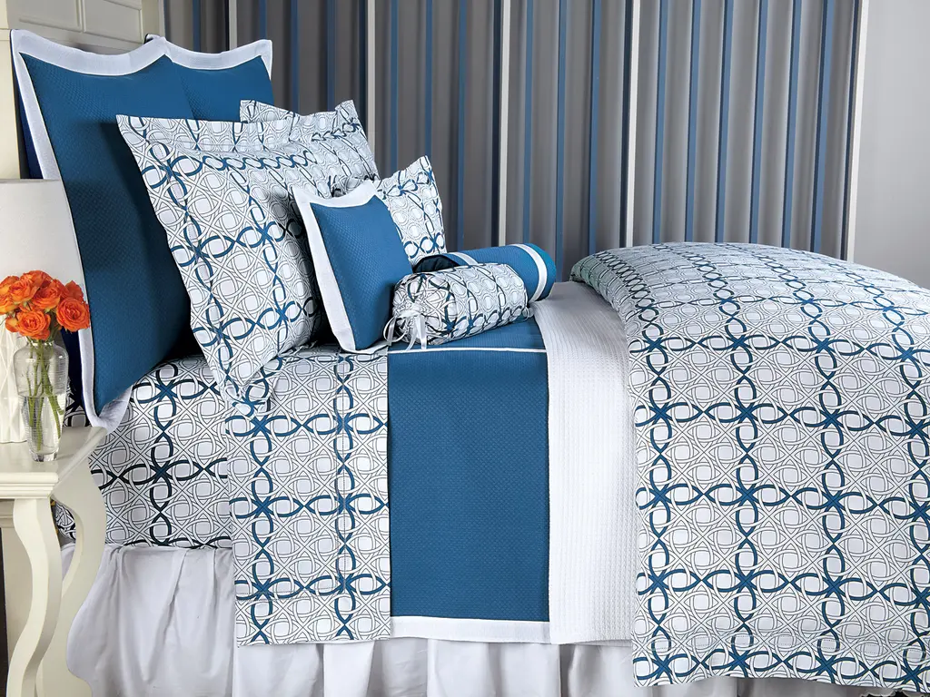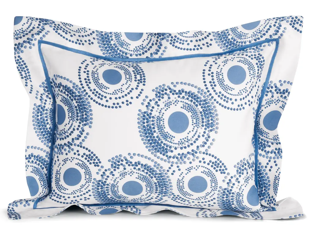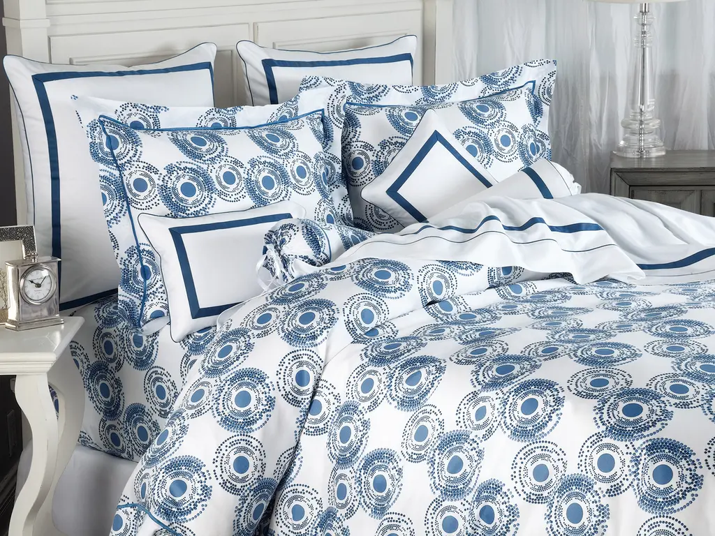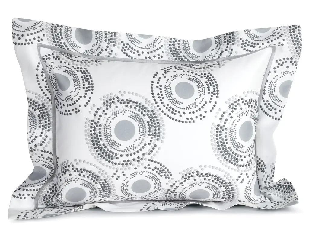 Fabulously refreshing, exceptionally original, this unique pattern is urban chic at its best. Contemporary circlets rain softly on 300 thread count Egyptian cotton sateen, sending magnificent ripples of vivacious energy out for your comfort and pleasure. Finished with masterful bourdon stitching and available in your choice of Gray or Blue. Made in Italy.