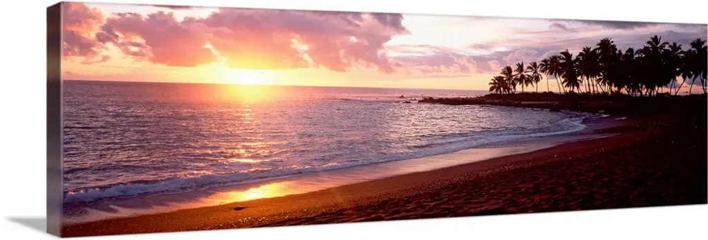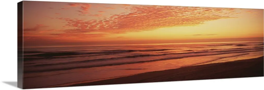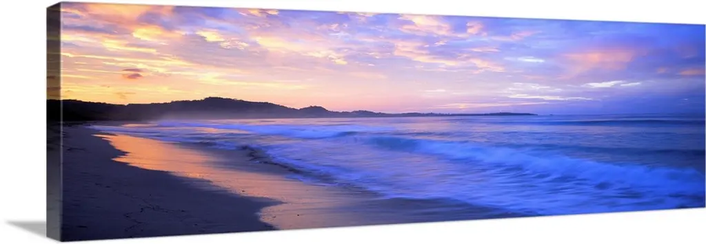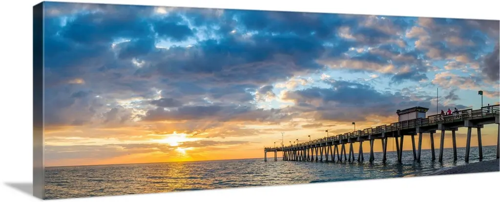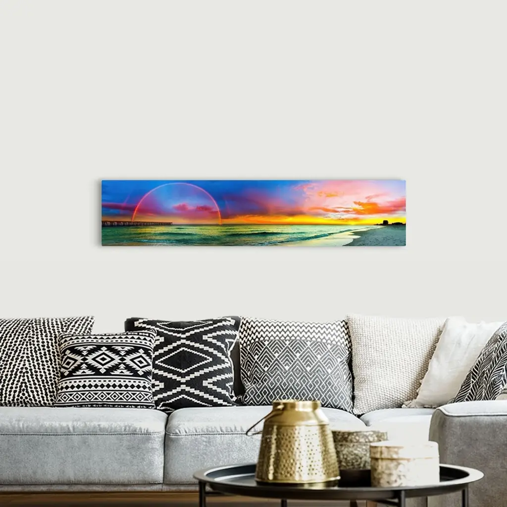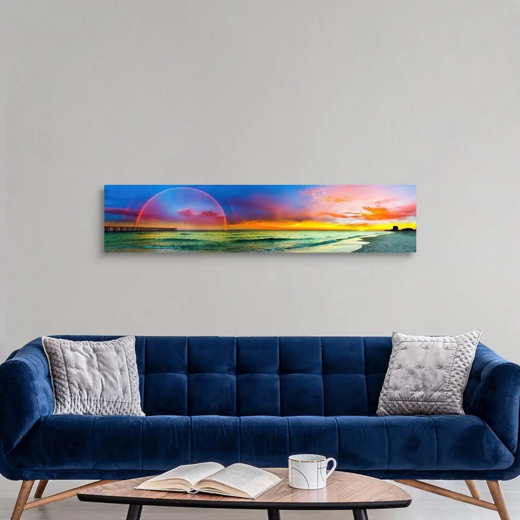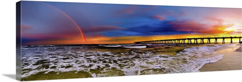 A full rainbow across an ocean pier at sunset. The blue, purple, and red sky along with the green sea produce all the colors of the rainbow.