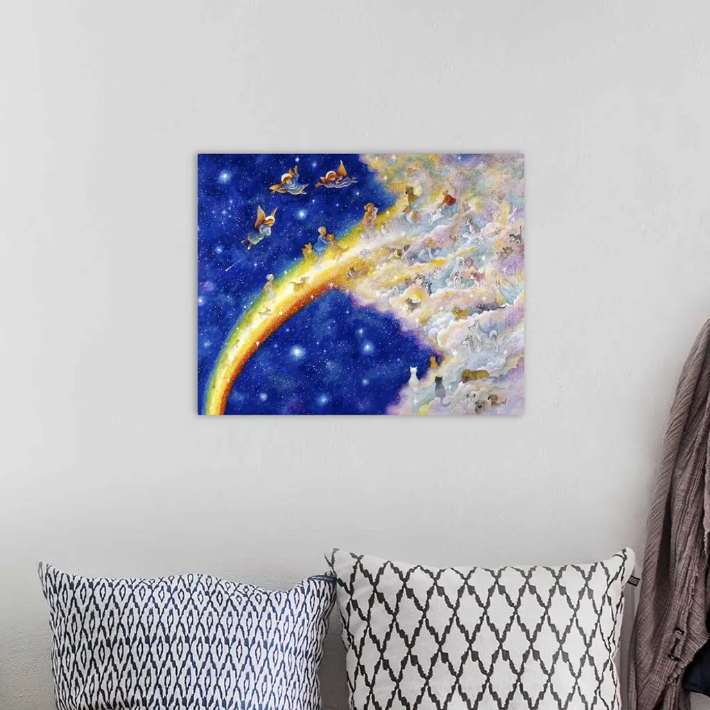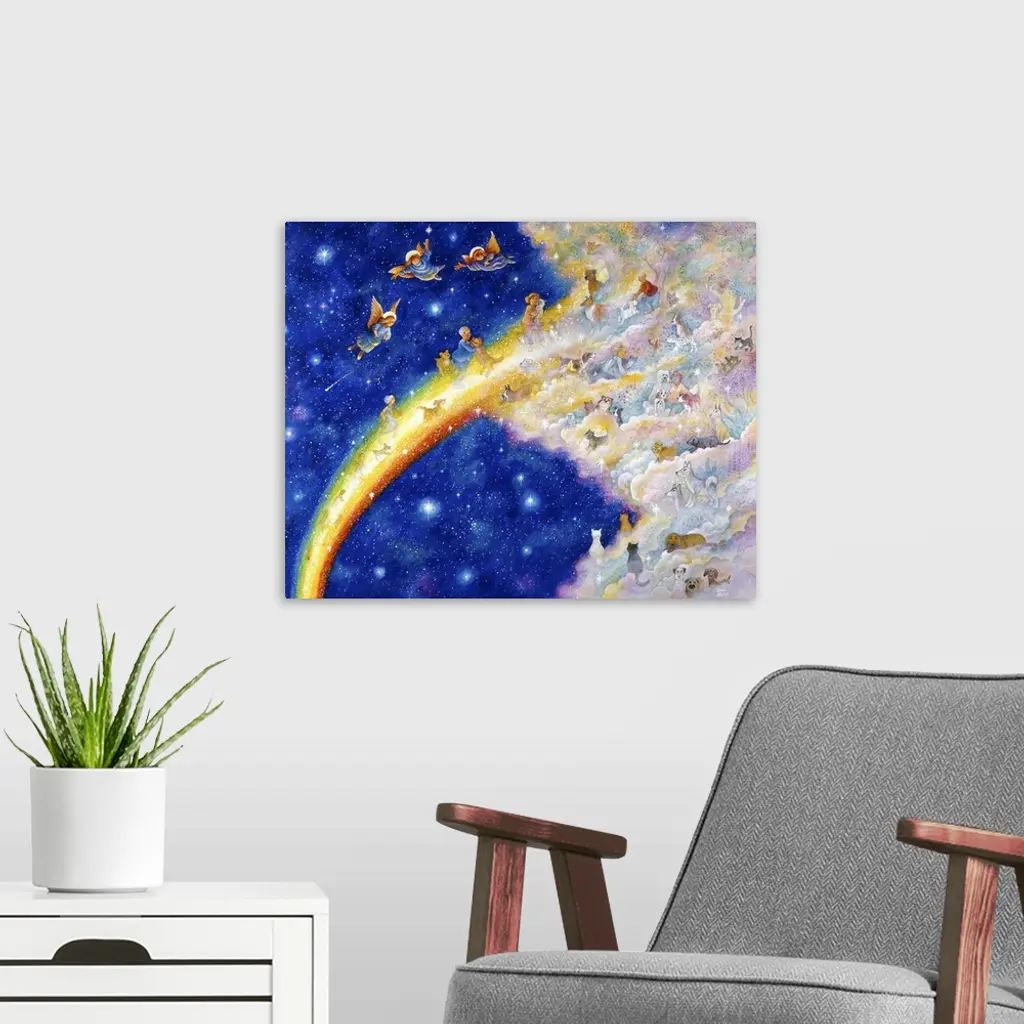 Pets in heaven with some owners coming over a rainbow to meet them. Some angels in sky above the bridge.