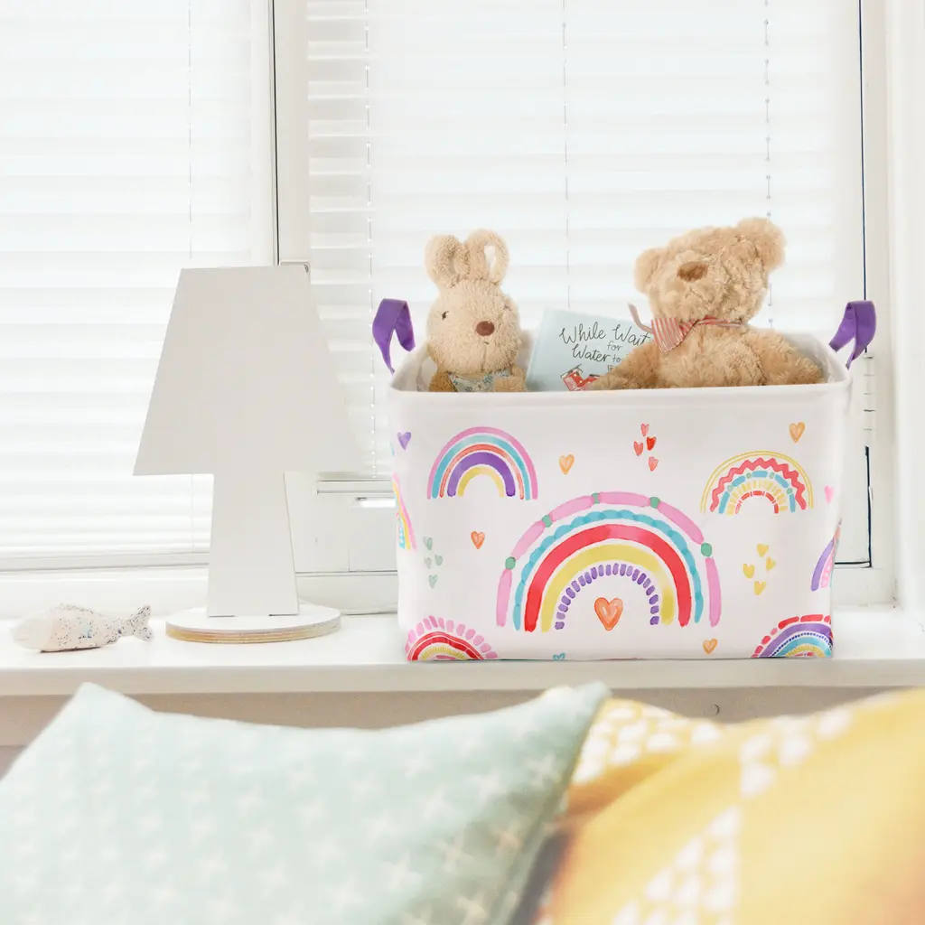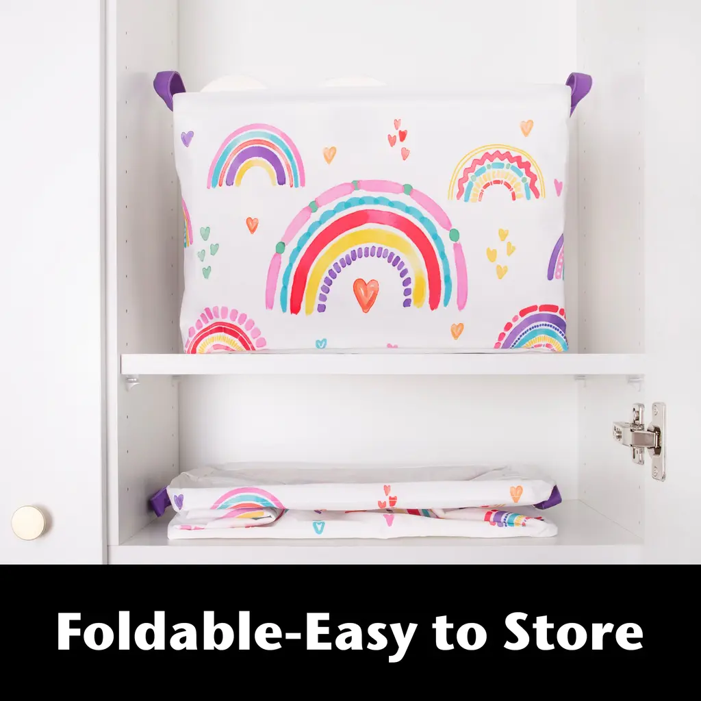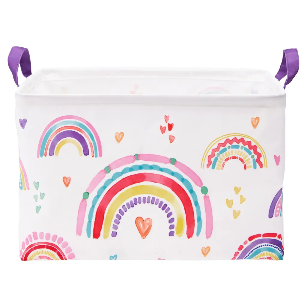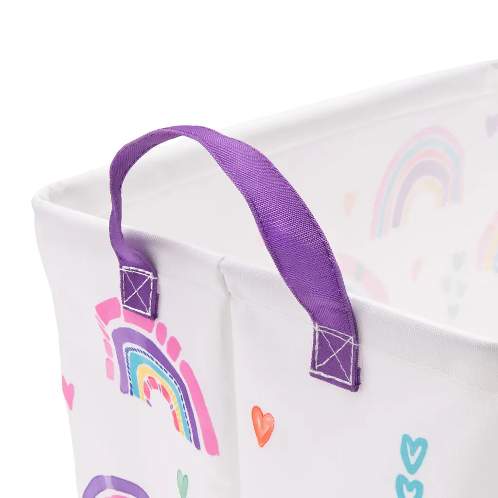 Create an enchanting atmosphere in your room with the Rainbow Hearts Rectangle Storage Bin by Allure Home Creation. This cheerful full coverage print piece, in refreshing multi-colored brights on a white background, features artsy rainbows mixed with romantic hearts. This eye-catching design is perfect for kids and tweens storage needs and will surely dress up and enliven any room they use it in. Crafted from 100% polyester with a printed exterior, a solid treated interior, and highlighted with bright purple handles. Spot clean with a damp cloth. Complete the look by coordinating with other pieces in the Rainbow Hearts Bath Collection or use alone.