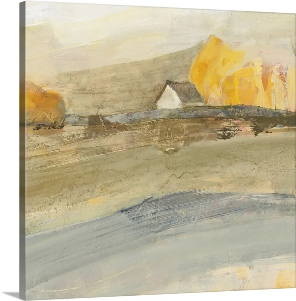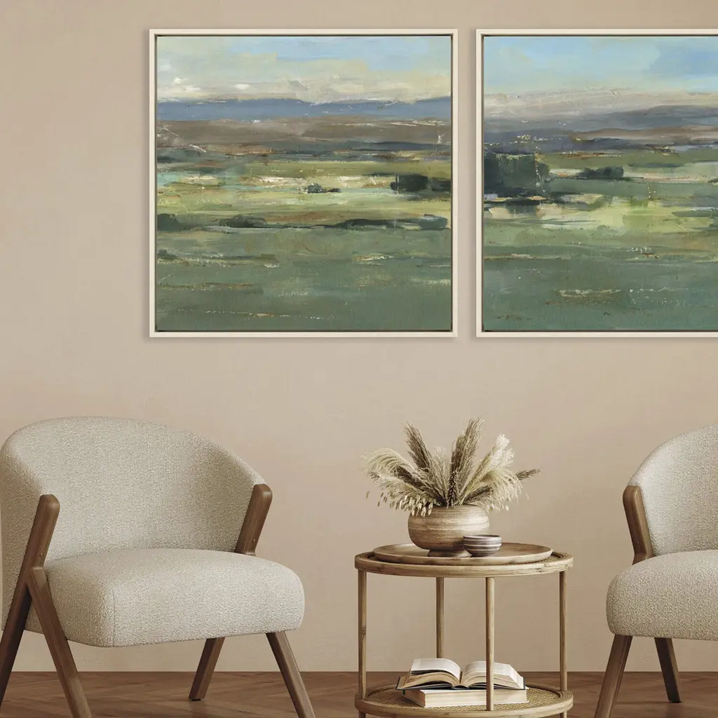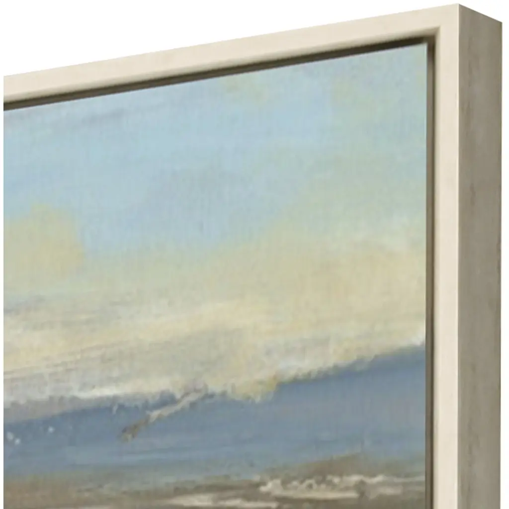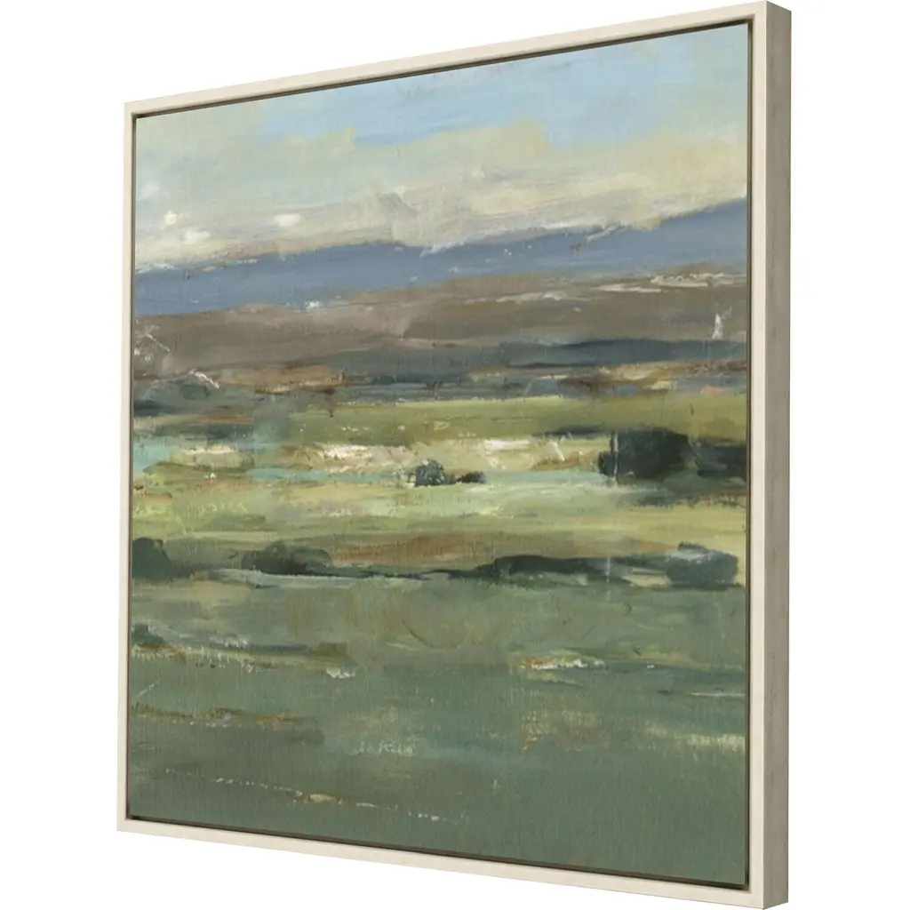 A dramatic valley is filled with breath-taking color. Canvas is wrapped around wood stretcher bars and mounted in a whitewash floater frame.