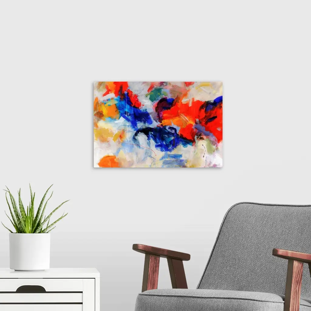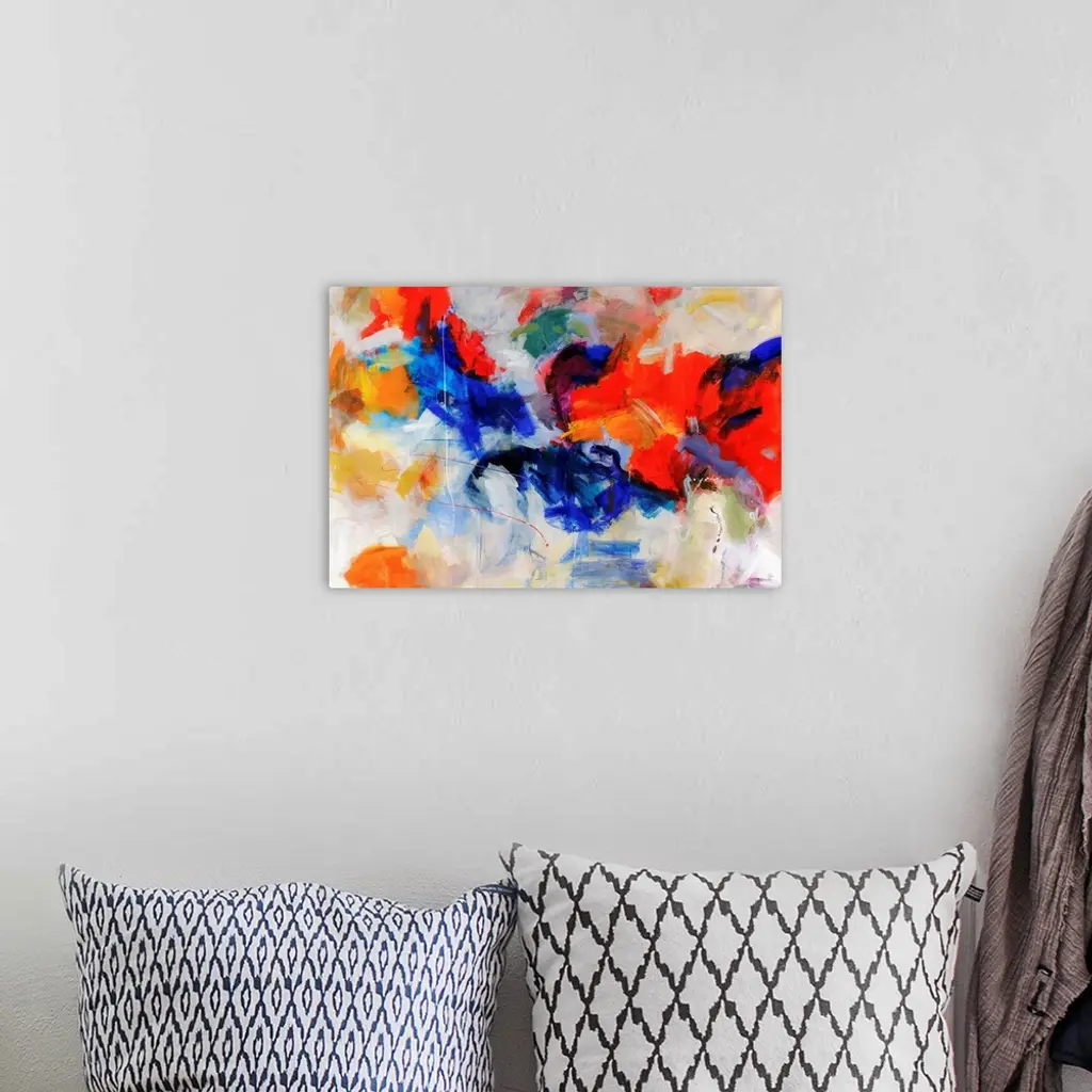 Wall art of an abstractly painted canvas of different blotches of bright colors put together.