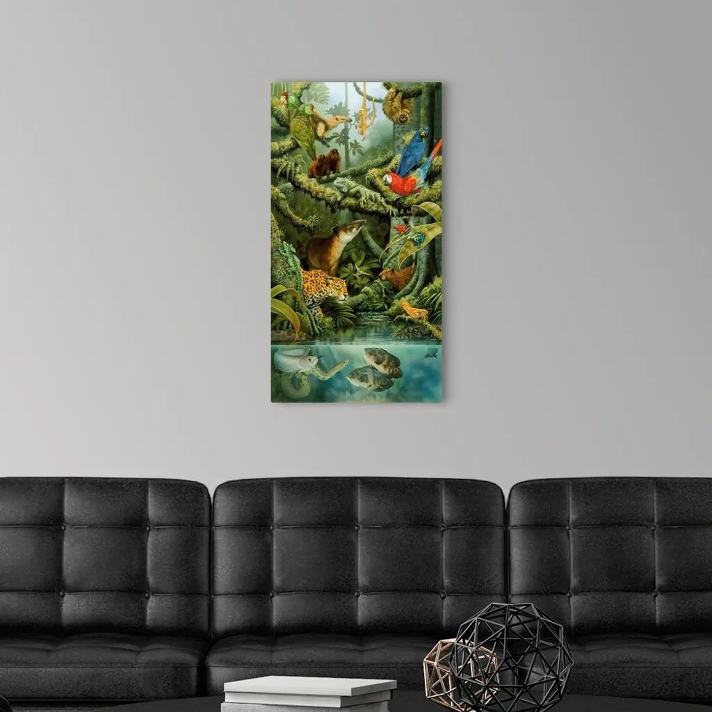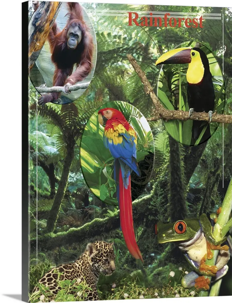 Parrots, an anteater, leopard, sloths, frogs and other rainforest animals