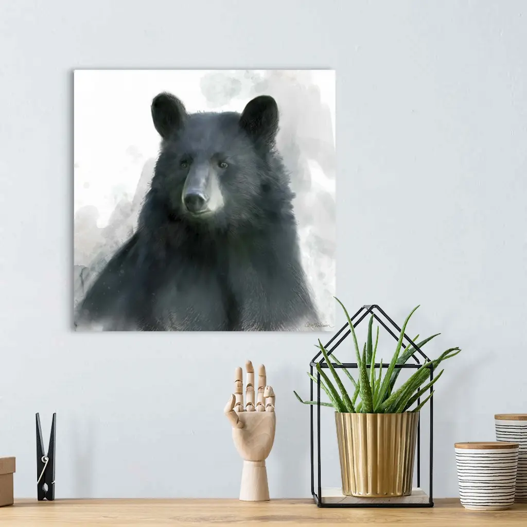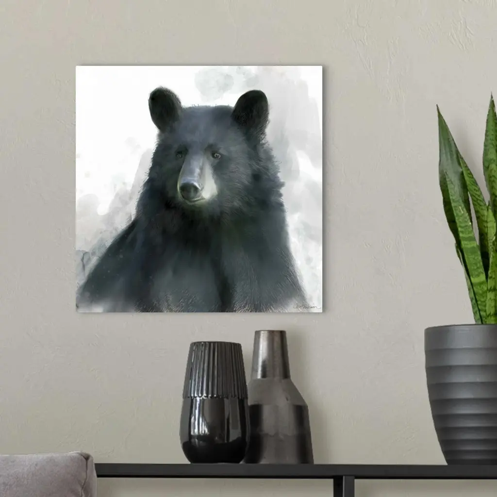 Watercolor portrait of a black bear on white.