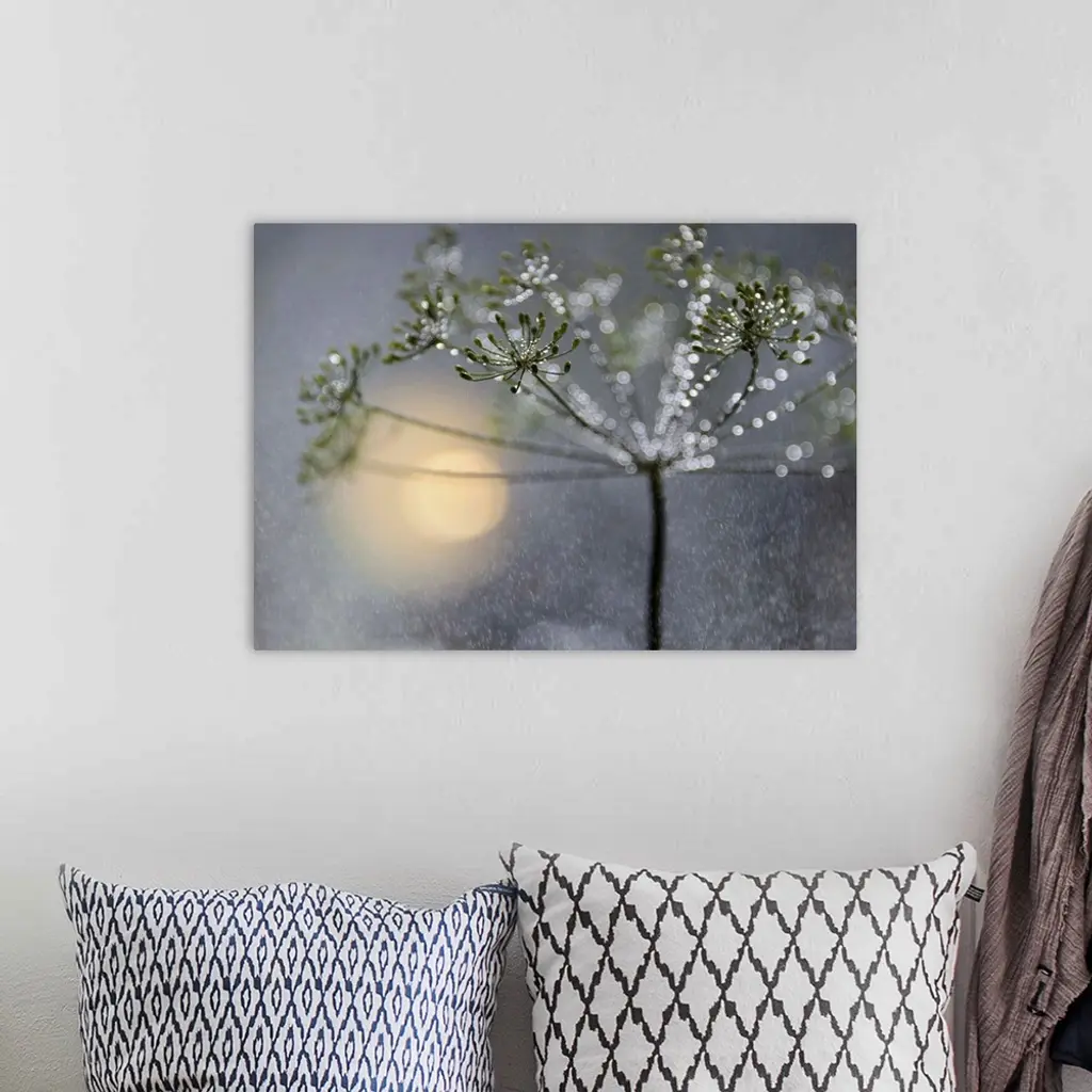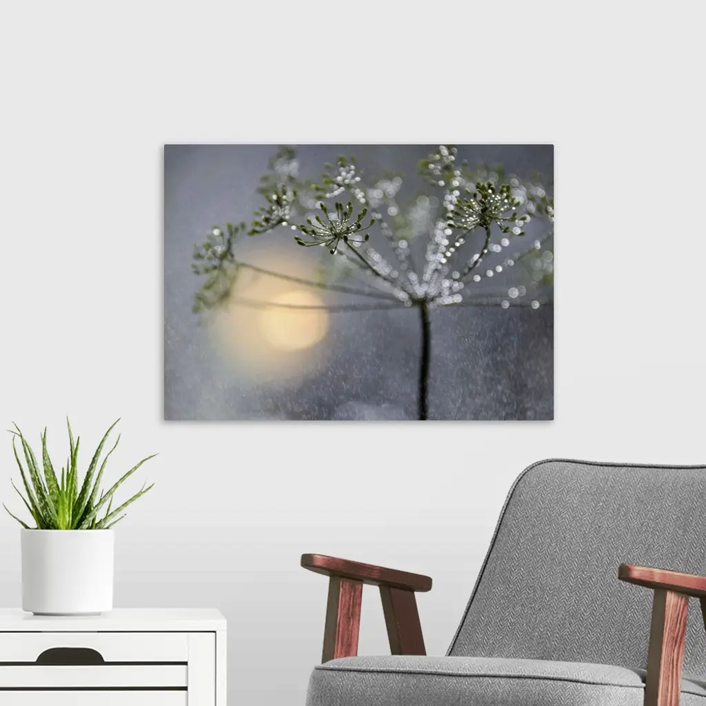 A macro photograph of a thin flowering plant with beads of water hanging from it.