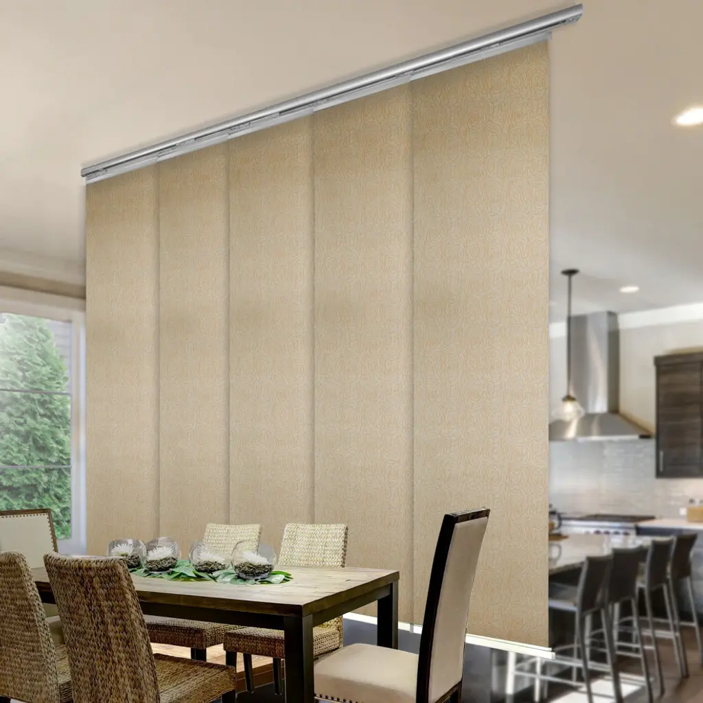 Central Design Products is pleased to introduce a new innovative panel track that offers easy 2-way installation, adding an alluring style and refined touch to your home decor. The single rail design of the track is sleek, compact, and reduces the overall footprint and weight of the installation, eliminating bulky, intrusive window treatments. Adjusting the panel height is a breeze � simply trim the panel, re-attach the liner, and install the panel weight. Detailed instructions are included.The panel track also features a patented slider design, made with aluminum and fitted with bearings that allow for durable and smooth operation. The sliders are stacked closer together than conventional panel tracks, reducing light bleed coming from the gaps between panels. This track has endless uses from dividing rooms, garages, offices, and closets to decorating windows and patios. Available in larger sizes including 8, 10, and 12 panels. Extends from 58-110� wide. Each panel measures 23.5" wide and 91.5" tall, with a total installation height of 94" (includes the 2.5" rail track). The track can be wall or ceiling mounted. The panels can stack on the left or the right. The clearance from the wall is extendable from 1.25� to 3.25� and projection from the wall is extendable from 3� to 4.25�. Raisa panel is made from 100% Polyester, with a light filtering shade that blocks 70% of the light.