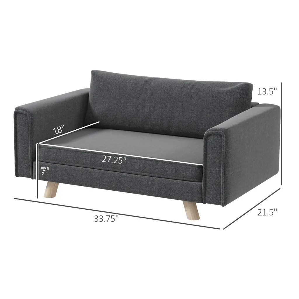 Keep Comfortable: Our pet sofa bed has a thick padded seat cushion and back cushion to lay on that keeps pets snug. The seat cover can be removed and washed, and the back cushion can be directly washed, so our fancy dog bed can be clean and cozy.Spacious Dog Sofa: Provide your pets with lots of room to lay and stretch out, keeping them happy and relaxed on a fluffy, plush place all their own.Easy to Maintain: The outer fabric is hydrophobic, so water and urine on the pet couch are easily removed with rags and paper towels, preventing stains.Safe and Secure: Constructed with multilayer board and pine wood legs, our couch for dogs is a strong and durable piece of furniture. Anti-slip footpads on the bottom make a dog couch bed that won't slide around when pets use it.Dog Sofa Bed Dimensions: 33.75" W x 21.5" D x 13.5" H. Seat: 27.25" W x 18" D x 7" H. Cushion: 27.25" L x 18.75" W x 1.5" D. Suitable for medium and small dogs up to 33 lbs. and 17.75" in body length. Assembly required.