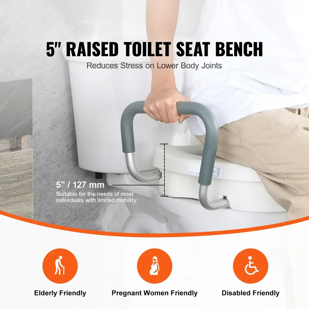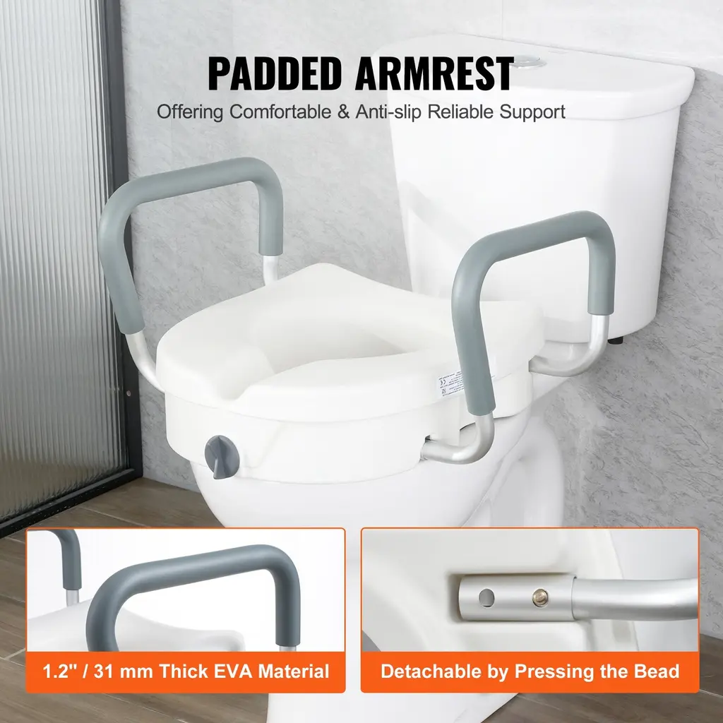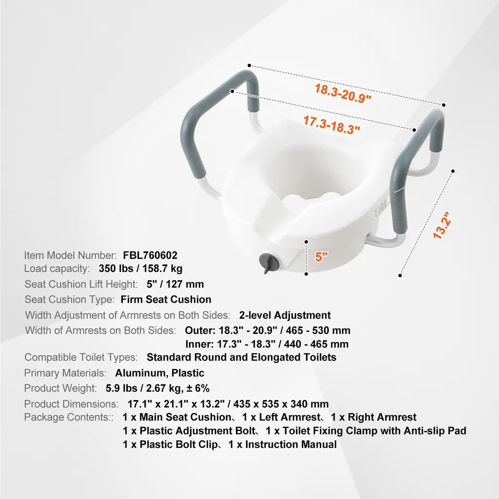 5" Elevated Toilet Seat: Our elevated toilet seat raises the toilet seat by 5" / 127 mm, providing a comfortable toileting option for pregnant women, seniors, injured individuals, and people with disabilities, reducing joint strain. Twist Lock Installation: This toilet seat needs to be installed above the toilet bowl, with minimal requirements for the toilet shape, suitable for most standard round and elongated toilets. 16.9" - 18.9" Inner Armrest Width: Considering comfort when sitting down, we offer adjustable armrests design, allowing for a more suitable distance between the armrests to accommodate diverse individuals and bathroom spaces. Armrests with Soft Padding: Specially designed with 1.2" / 31 mm thick padded armrests, providing comfortable and reliable grip, offering extra assistance when sitting or standing. Sturdy Materials and Construction: Constructed mainly from aluminum and high-strength plastic, the elevated toilet seat is durable and can support up to 350 lbs, ensuring individuals of different body shapes and weights can use it with confidence. It's also easy to clean throughout. Package Content 1 x Main Seat Cushion 1 x Left Armrest 2 x Right Armrest 1 x Plastic Adjustment Bolt 1 x Toilet Fixing Clamp with Anti-slip Pad 1 x Plastic Bolt Clip 1 x Instruction Manual