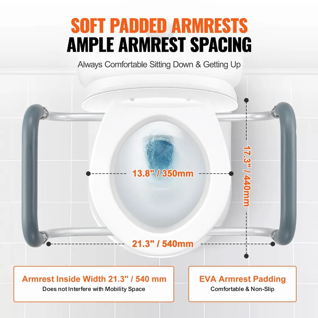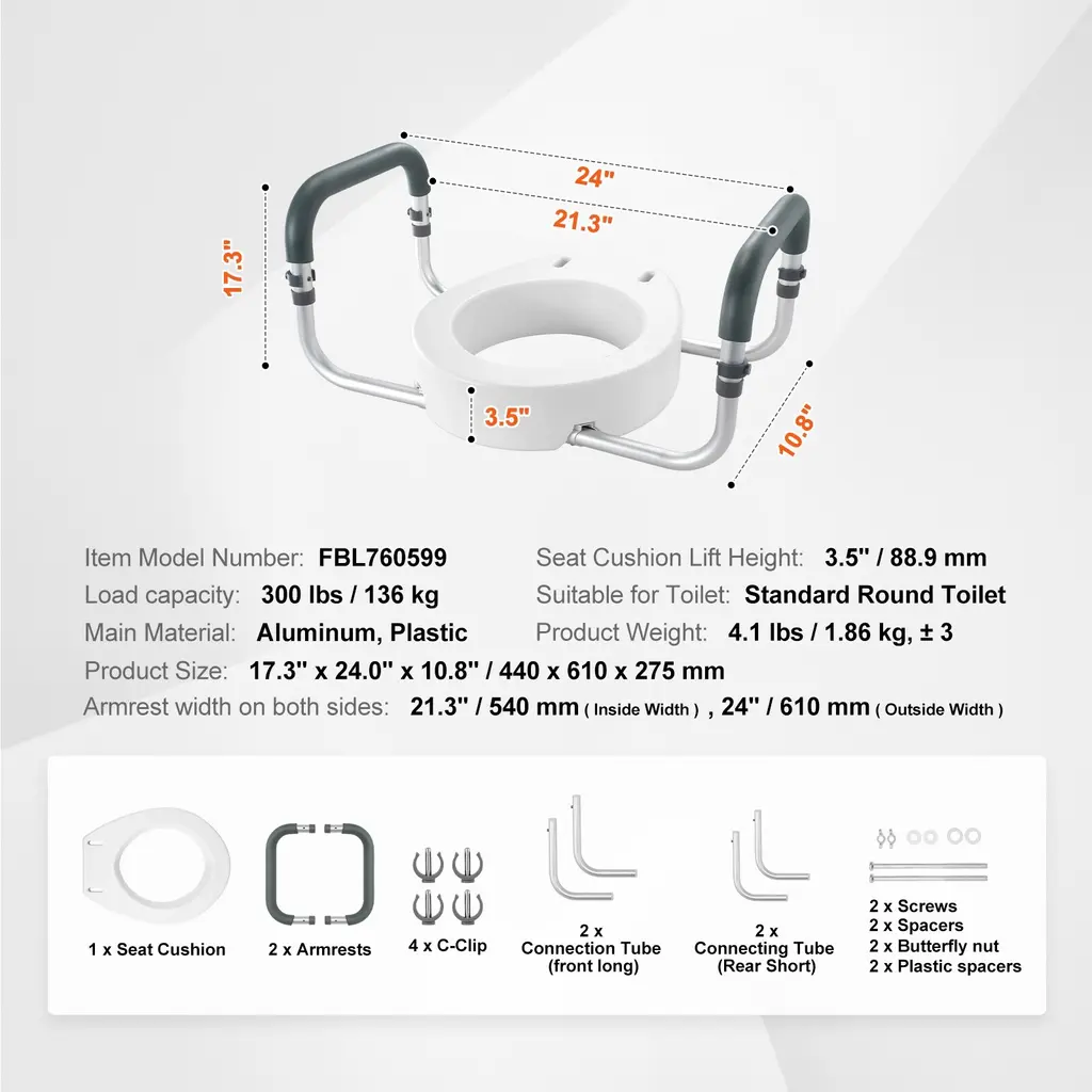 3.5" Raised Toilet Seat: This toilet seat pad of ours can be elevated to raise the toilet ring by 3.5" / 88.9 mm, providing a comfortable toileting option for pregnant women, the elderly, the injured, and the disabled, and reducing the burden on joints. Compatible with Standard Round Toilets: This toilet needs to be installed underneath the toilet lid, which is required for the shape of the toilet, and fits most standard round toilets. Armrests with Soft Padding: The specially designed 1.4" / 35 mm thick armrest padding provides a comfortable and reliable grip and extra help when sitting or standing. Sturdy Materials and Construction: Mainly made of aluminum and high-strength plastic, the raised toilet seat is sturdy and durable, with a weight capacity of up to 300 lbs, which is safe for people of different body weights and easy to clean all over. 4-Step Installation: The raised toilet seat can be securely fastened with the included screws and washers without the use of tools, and does not take up much space in your bathroom after installation. Package Content 1 x Seat Cushion 2 x Connection Tube (Front Long) 2 x Connecting Tube (Rear Short) 2 x Armrests 4 x C-Clip 2 x Screws 2 x Butterfly Nut 2 x Spacers 2 x Plastic Spacers 1 x Instruction Manual
