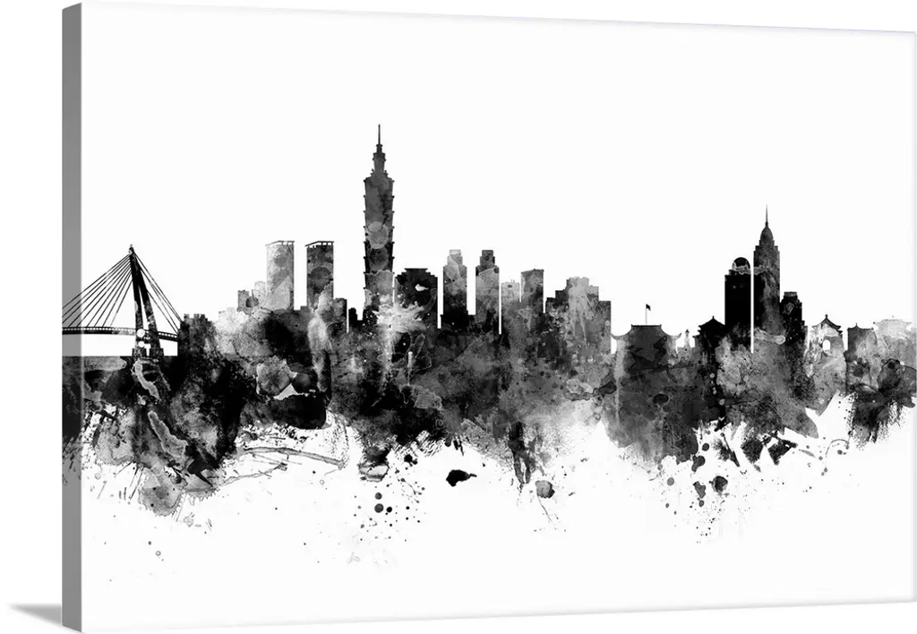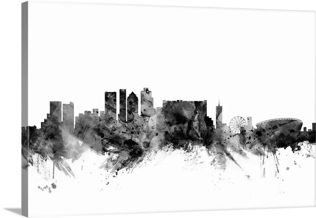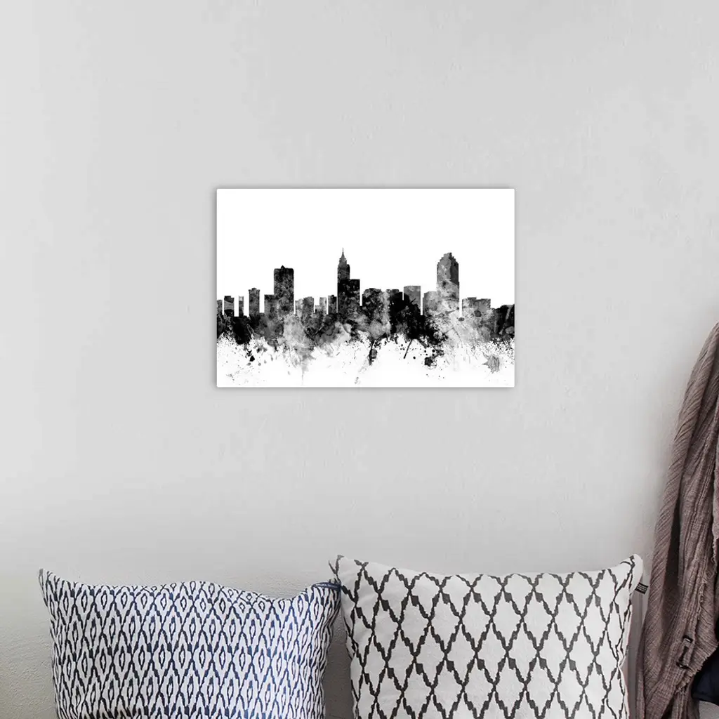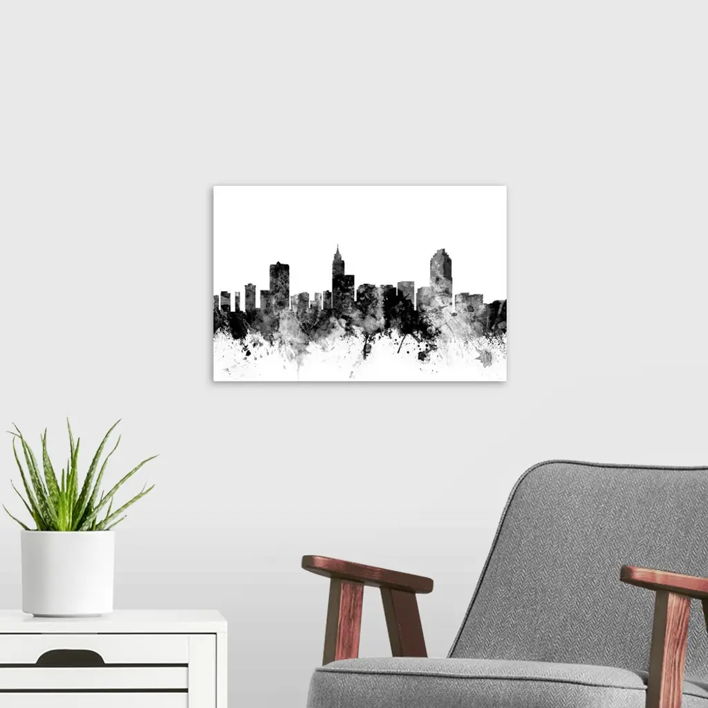 Smokey dark watercolor silhouette of the Raleigh city skyline.