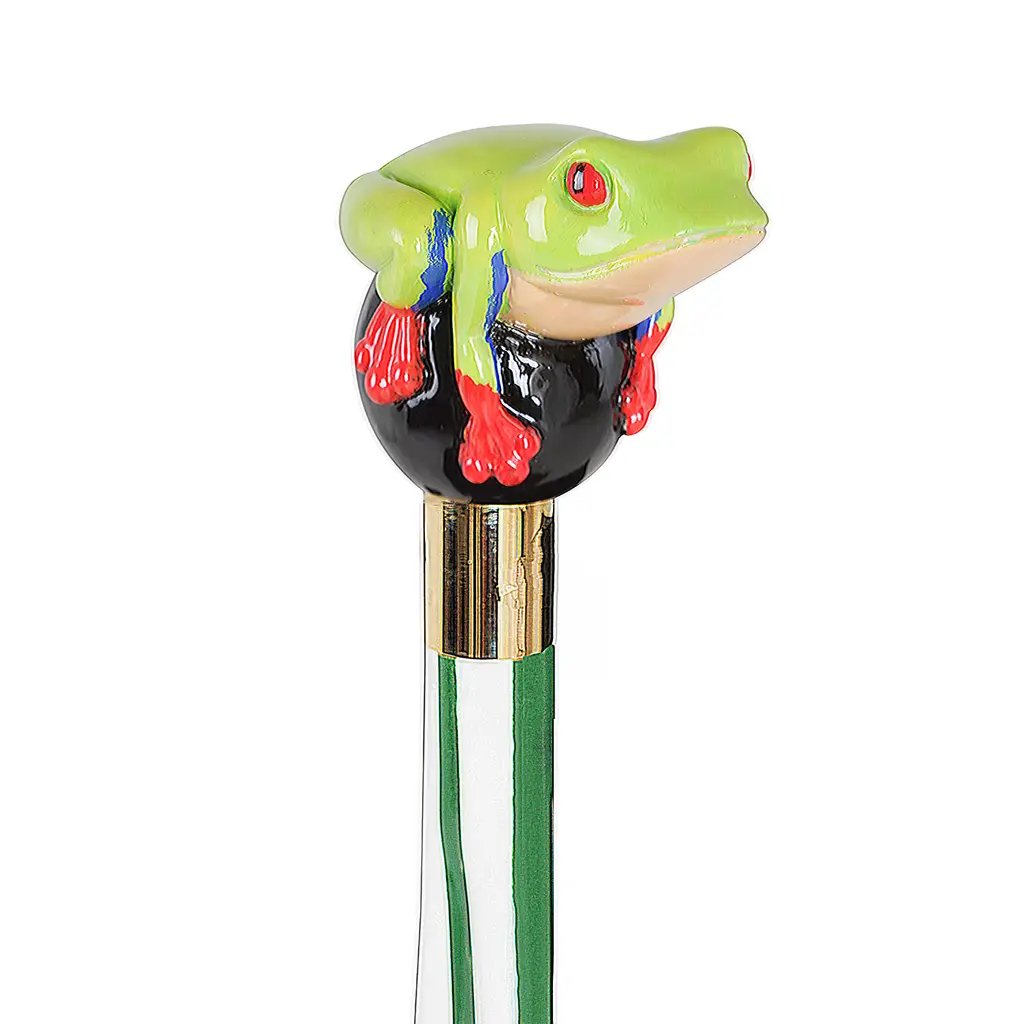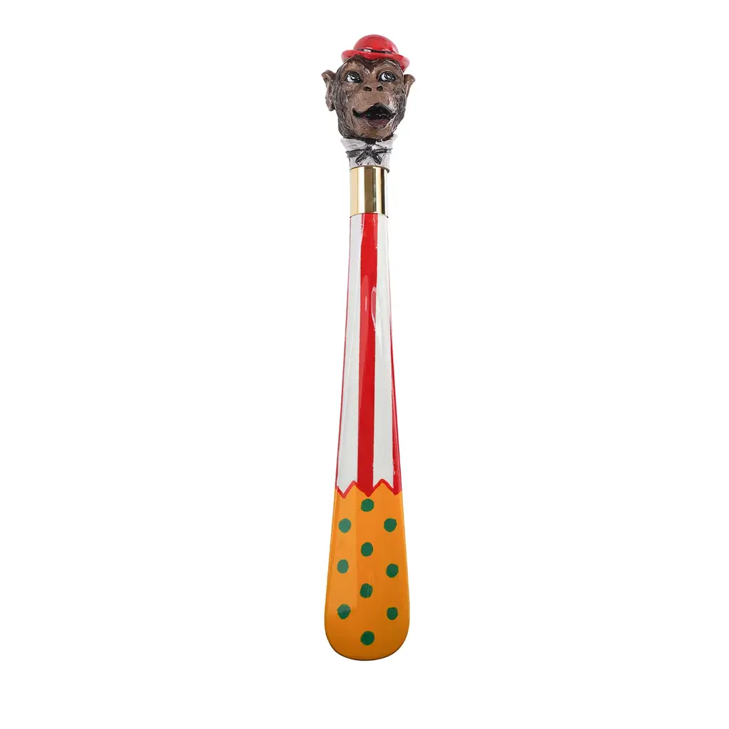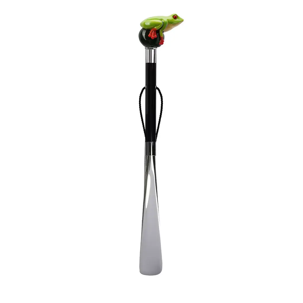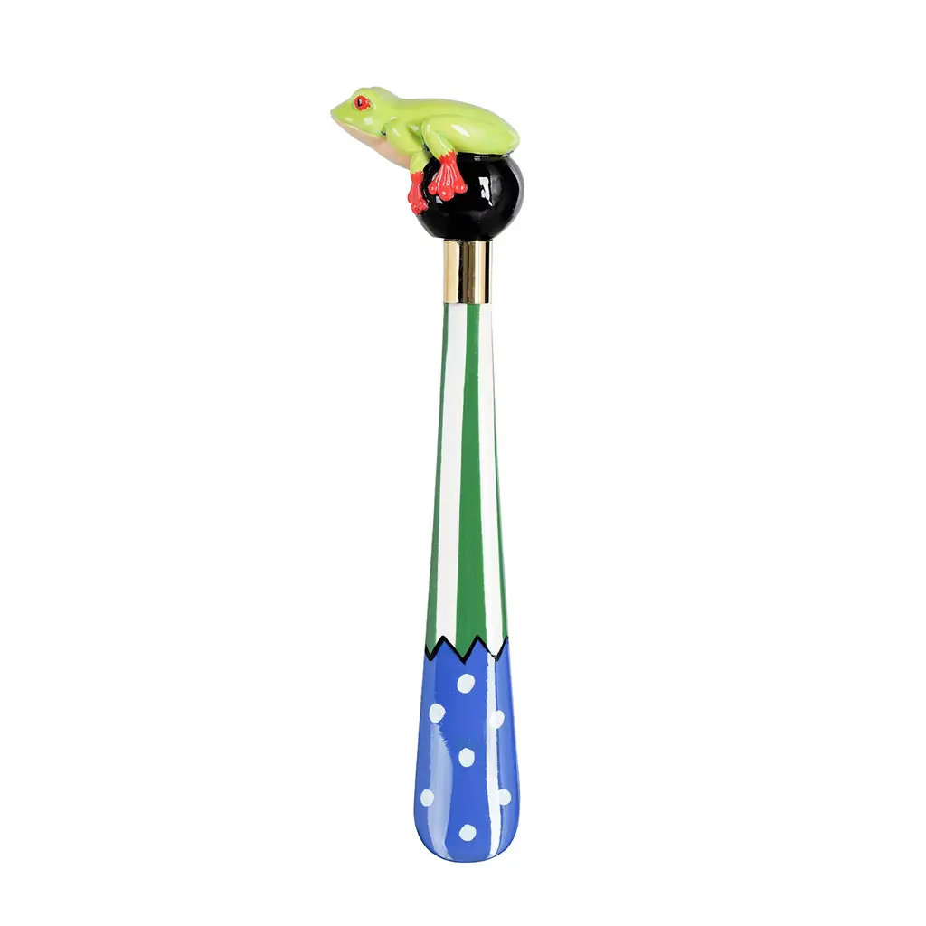 A frog perched on a black sphere defines this shoehorn's whimsical design. Equipped with a glistening brass ring connecting the marble powder detail and functional shoehorn, the handle sits atop a colorful ABS paddle that gets finely hand-painted in a combination of different patterns further revealing the piece's eccentric character.