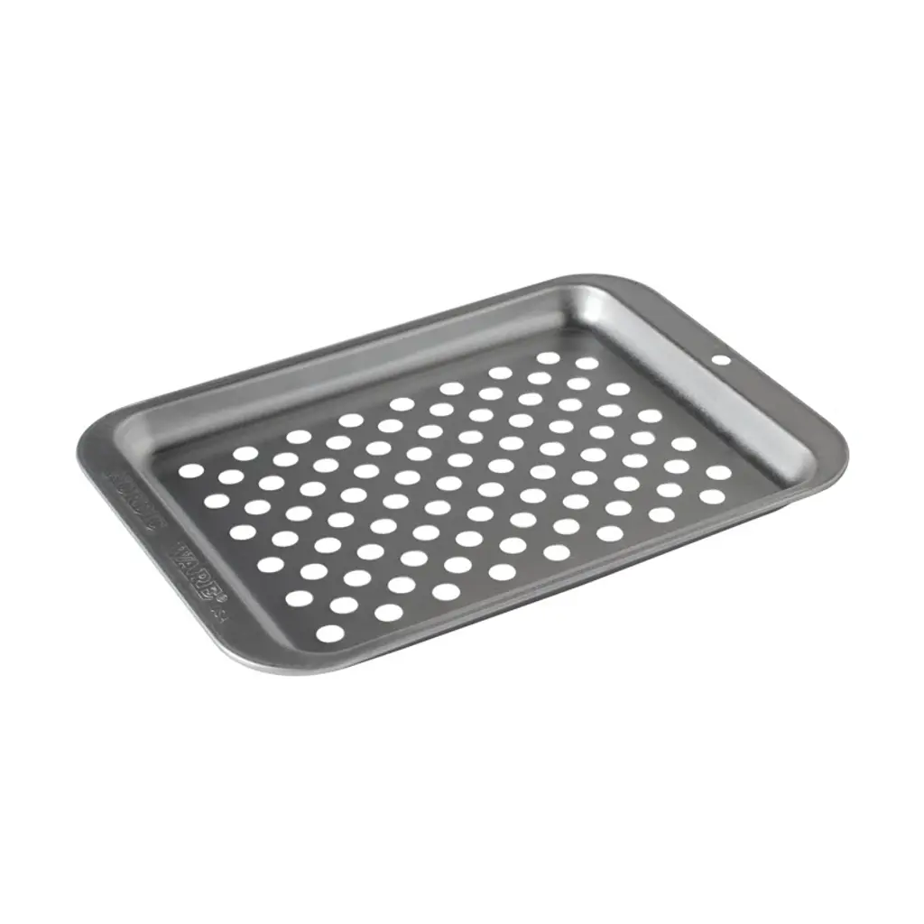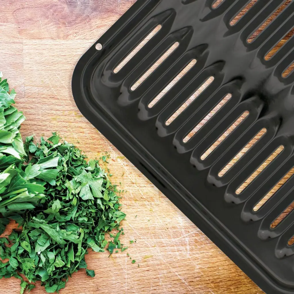 Enjoy fresh, healthy cooking with the Range Kleen 5 Piece Heavy Duty Broiler Pan Set! Range Kleen's Heavy Duty Broiler Pans are crafted from durable steel and are dishwasher safe for easy cleaning! The stick-free porcelain finish ensures easy clean-up, and these broiler pans can withstand temperatures up to 1025˚F and open flames. It's easy to broil your family's favorites with one full-sized broiler pan and one toaster oven-sized broiler pan. Grates in the broiler pan tops allow fat to drip away from meat, ensuring you prepare healthier meals. In addition to the oven, these Broiler Pans can be used on the grill to prevent more miniature food from slipping through grill grates. With two broiler pans at the ready, cooking for your family will be a breeze! When it's time to clean up, the Scrape and Kleen scrapes away baked-on messes and features rounded tapered edges to slide under stuck on debris without damaging broiler pans.