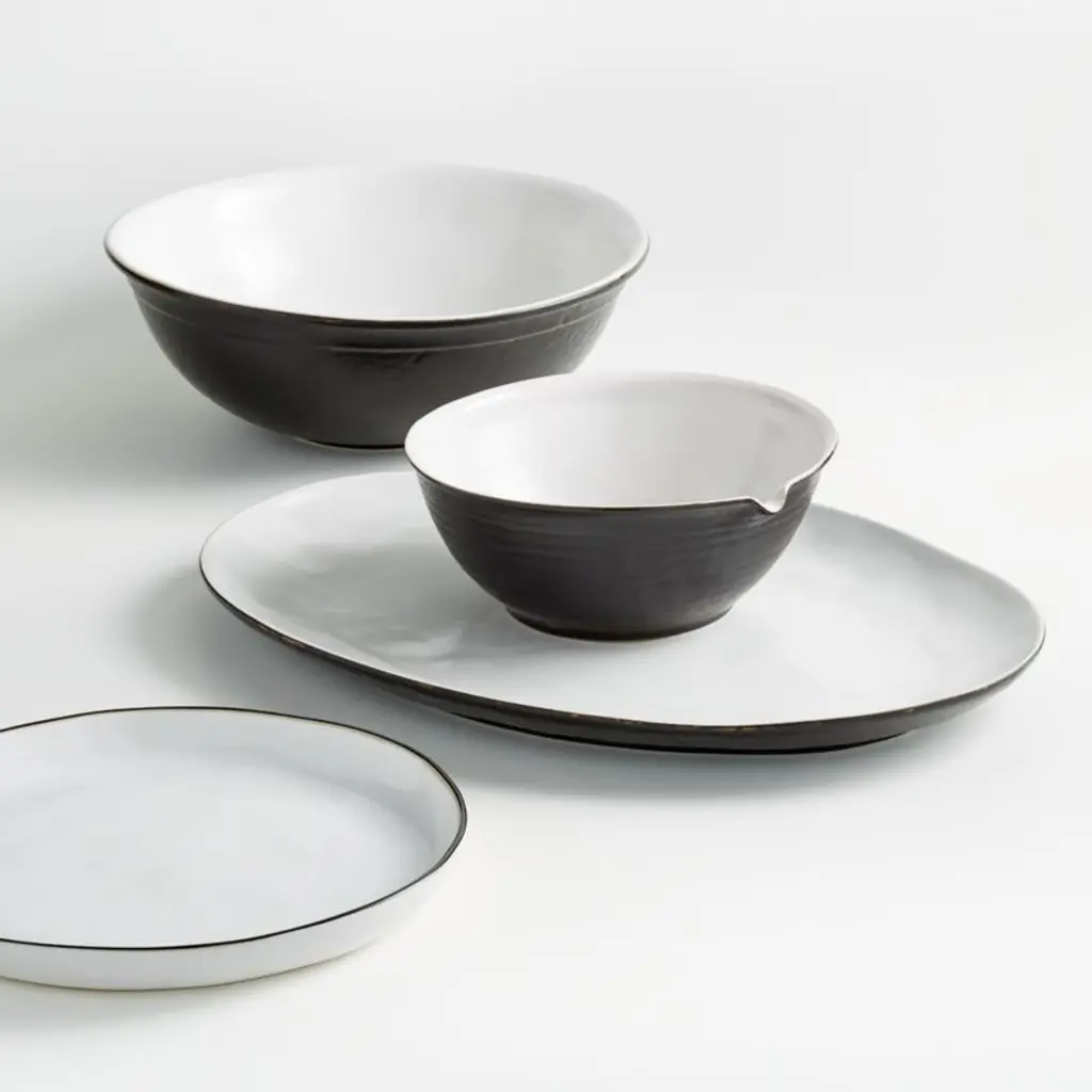 Rimmed in black, our white-glazed Range round platter showcases its perfectly imperfect artisanal edges. Hand-finished and -painted by talented craftspeople, the fine stoneware serving plate goes from warm oven to table for an organic yet elevated look. The serving piece cleans up easily in the dishwasher. Set a harmonious table with the coordinating black-and-white dinnerware, oven-to-table serveware and accessories in our exclusive collection designed by Leanne Ford.Curated and crafted around the world, our first furniture and decor collaboration with design star Leanne Ford brings her cool, effortless vibe home to you.