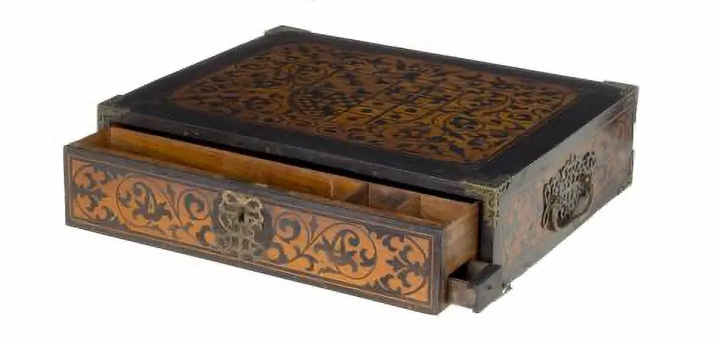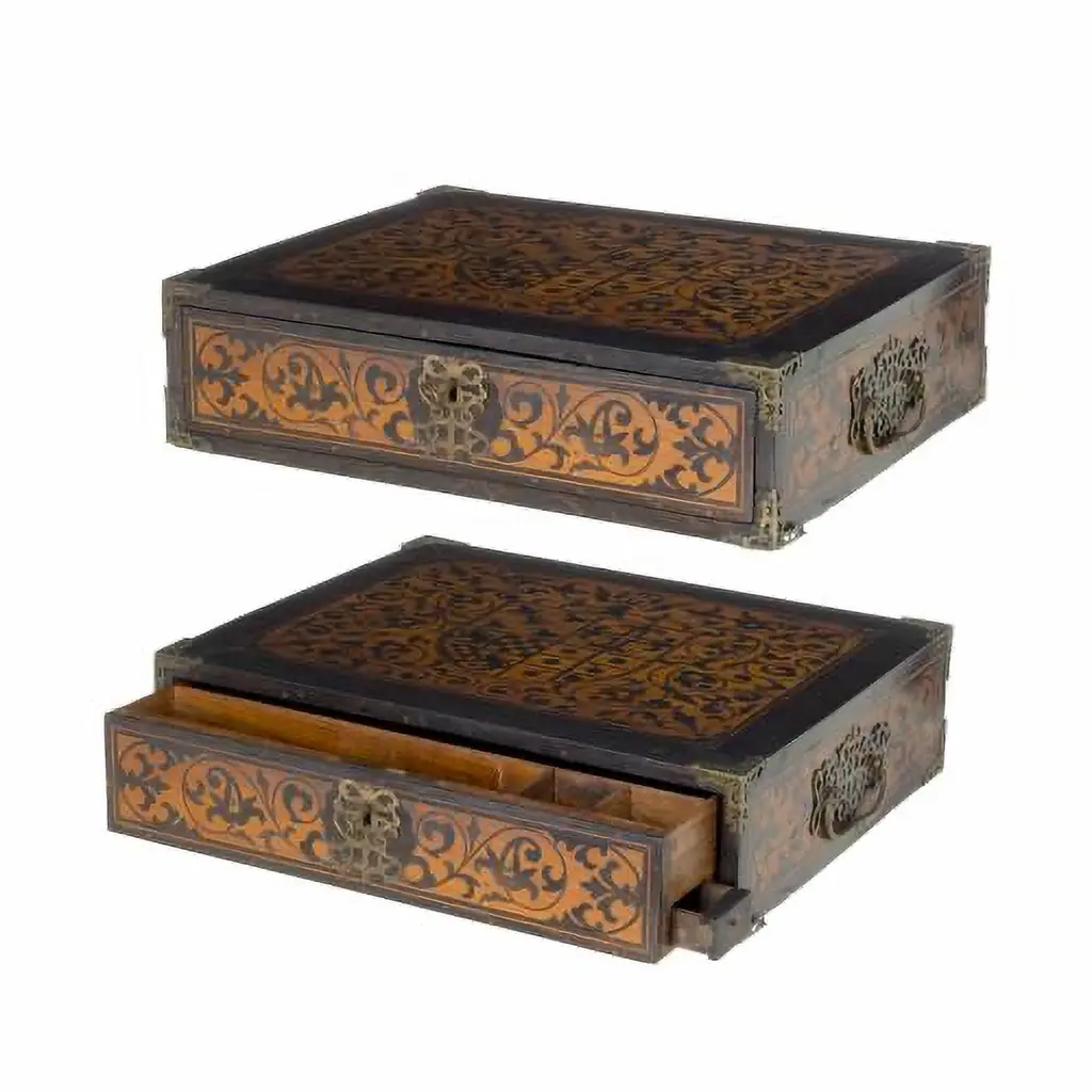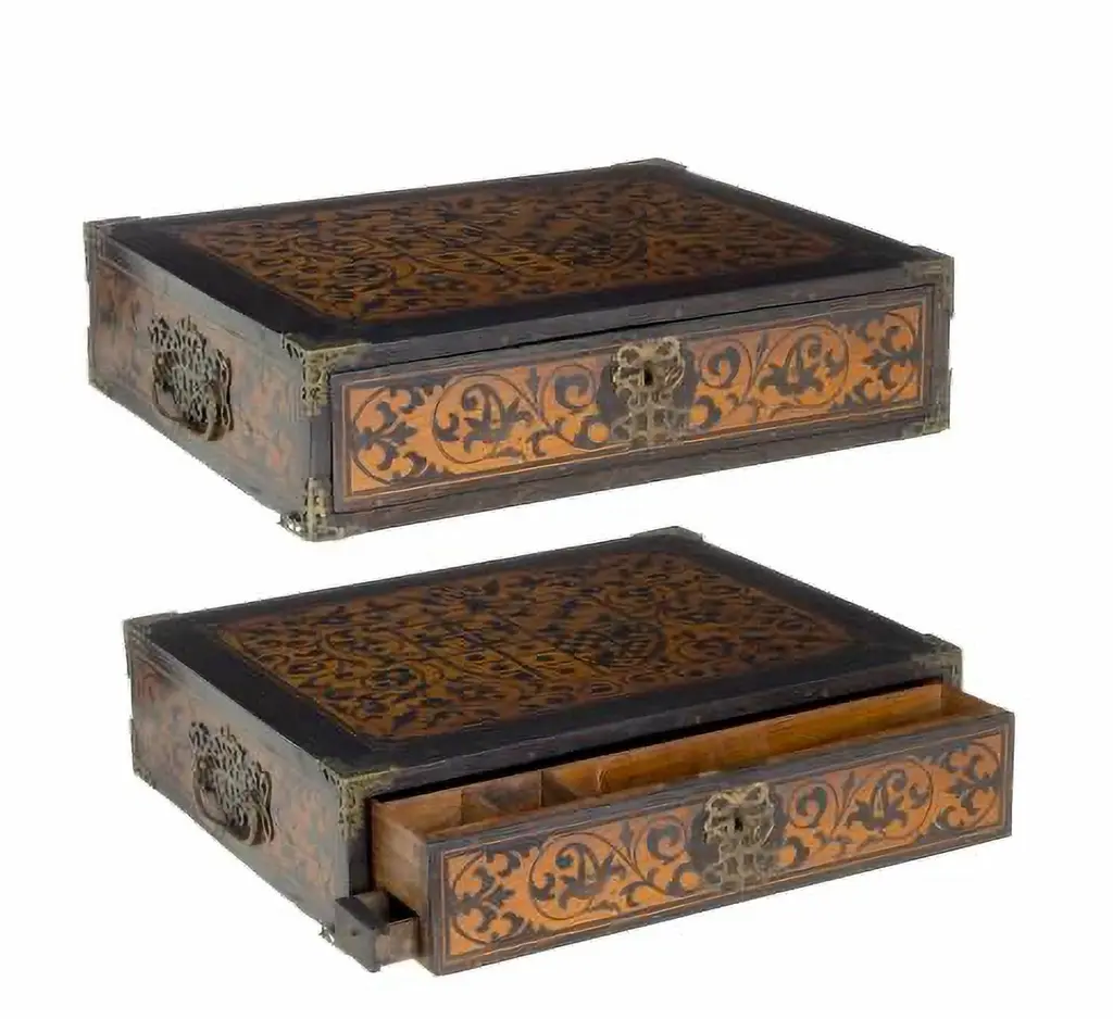 RARE ARMORED OFFICE DRAWERIndo-Portuguese, from the 17th century.in teak, ebony and sissoo.Ornamented with rosettes, fleurs-de-lis and quartered shieldInterior with divider.Frames, handles and corner reinforcements in golden brass.Period defects.Dim.: 11 x 40 x 33 cmoriginal conditions