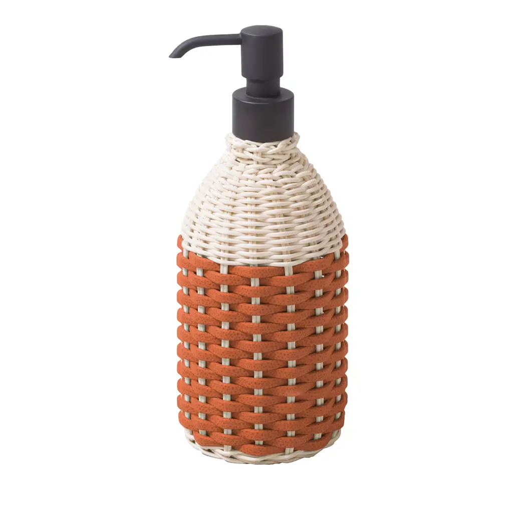 Ideal for maintaining a clean environment by offering easy access to hand sanitizer in hotels, yachts, offices, shops, and any high-traffic interior, this glass bottle (500ml) with a black-finished metal spout features a cover in woven natural rattan with mango-orange leather strips. This dispenser can be refilled with gel sanitizer of choice and is available also with mint, Sienna, and mocha leather and metal spout in polished chrome, brushed brass, and brushed bronze.