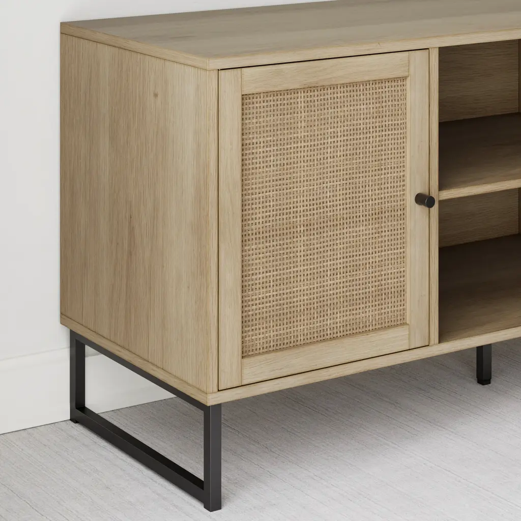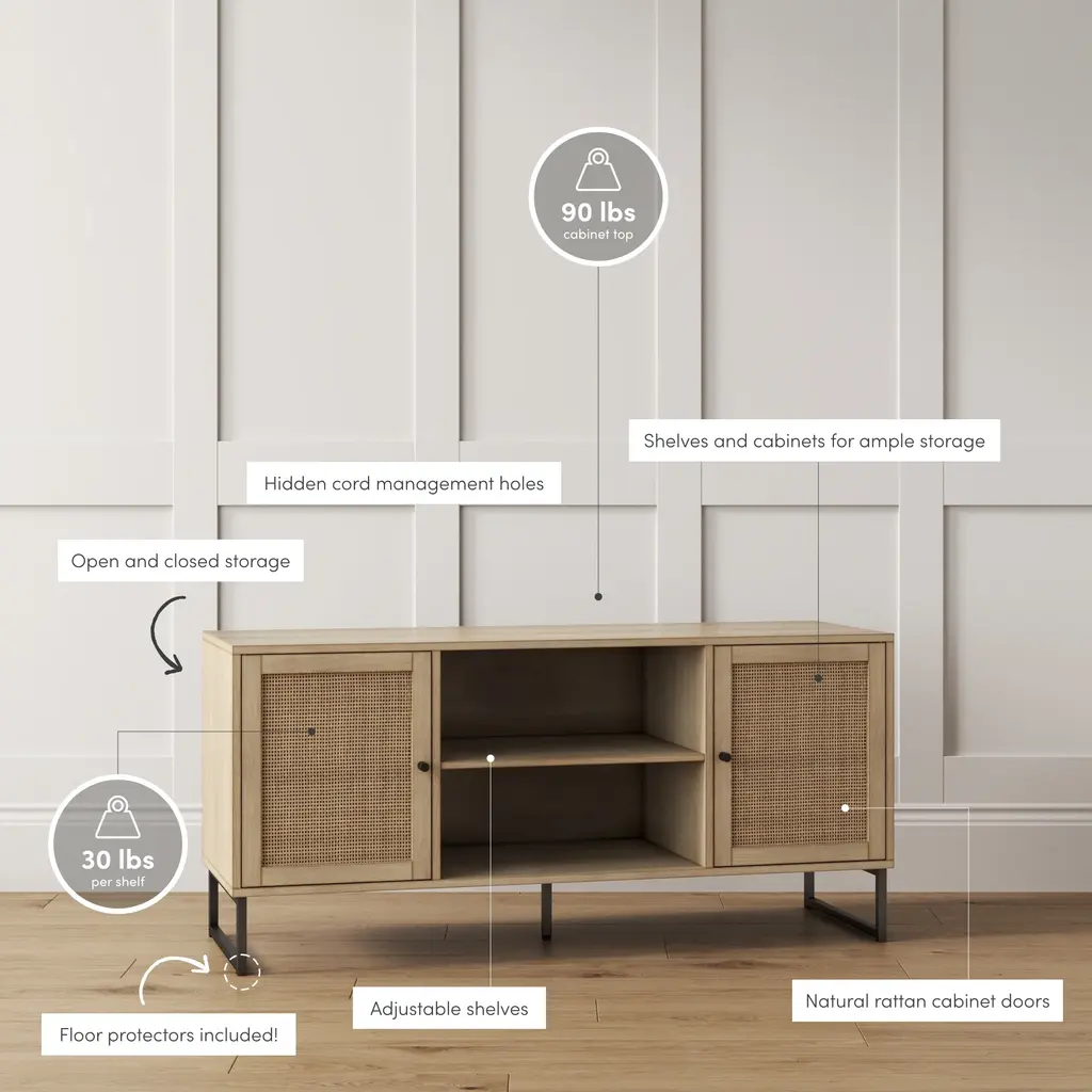 Say hello to Mina, the unit that offers hidden storage as well as beauty and warmth. This media unit combines a sturdy MDF oak finish frame, featuring 2 textured rattan-panel doors for a trendy, textured look. Doors are adorned with a stylish metal handle allowing you easy access to your belonging while the flat top surface is the perfect area for houseplants, books and other decorative accents. Open shelving makes room for your stereo or gaming system, with conveniently located cable management to run cords in the back of the unit. The cabinet doors feature adjustable shelves so you can create just the right amount of space that best suits your needs. This classic double-door cabinet can easily blend into a variety of decor aesthetics, enhancing the look of any room. The look is finished with sturdy powder-coated metal legs. • Recommended Minimum TV Size (Diagonal): 49" • Only the left and right shelf heights is adjustable and the center shelf is fixed • Recommended Maximum TV Size (Diagonal): 53"