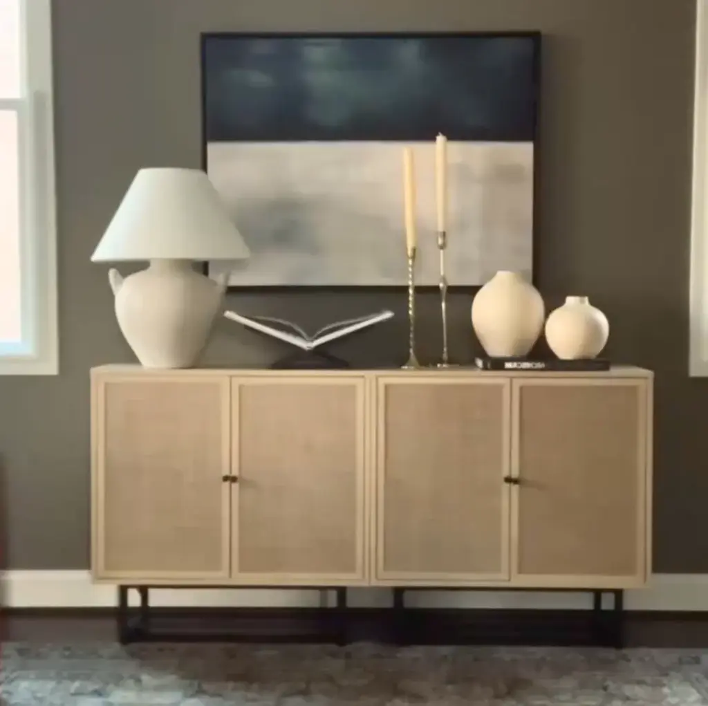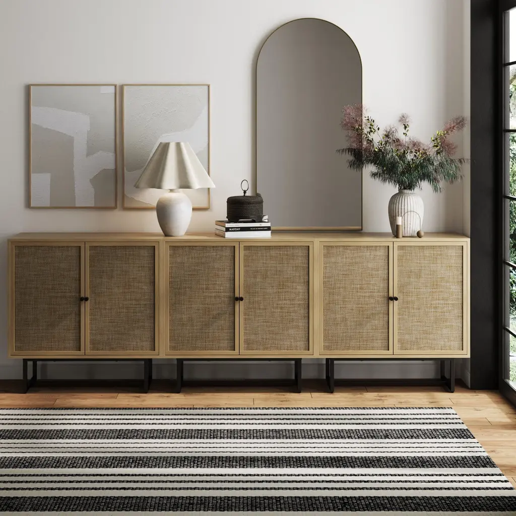We’ve got all the heart eyes for Kova! Kova’s natural color palette consists of a light oak laminate, cane door fronts, and black iron hardware. This set of 3 cabinets effortlessly blend beauty with functionality. Use them in your entryway to greet guests, in the living room to display your record player, or in your dining room as a spot to hold dinnerware. Open the front cabinets to reveal two internal shelves that are adjustable and will help keep any room looking organized!