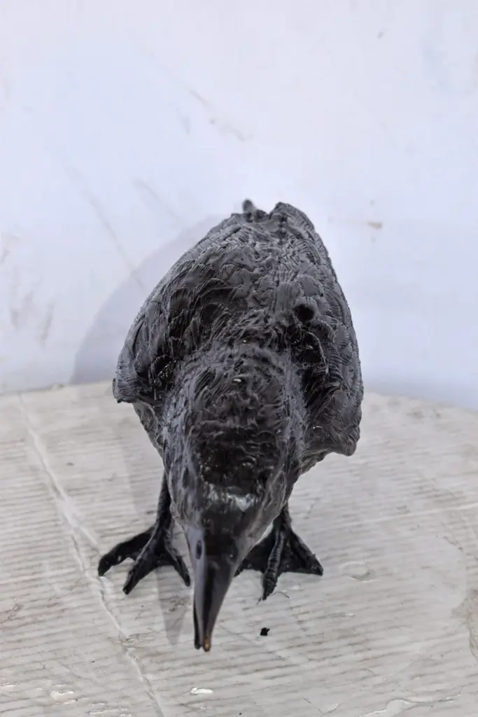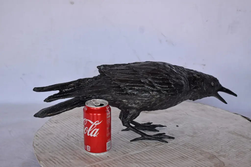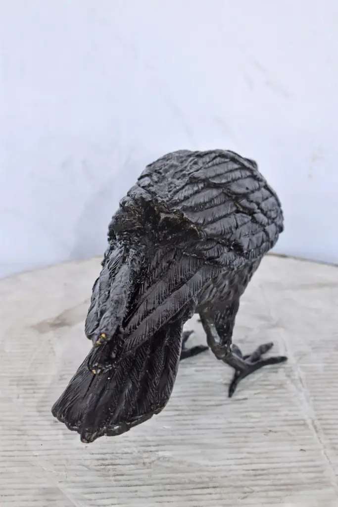 A Lifesize raven bird looking for food, bronze statue. Also known as the western raven found across the Northern Hemisphere, it is the most widely distributed of all corvids and is possibly the heaviest passerine bird. Please pay close attention to the details of this statue. This bronze statue is cast in the traditional lost-wax method, which highlights the exceptionally fine detail and guarantees lasting heirloom beauty. This bronze statue would look adorable in any space of the home of any bird lover. Size: 24"L x 6"W x 12"H. Weight is: 10Lb