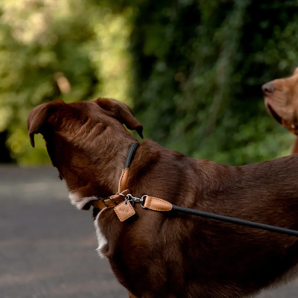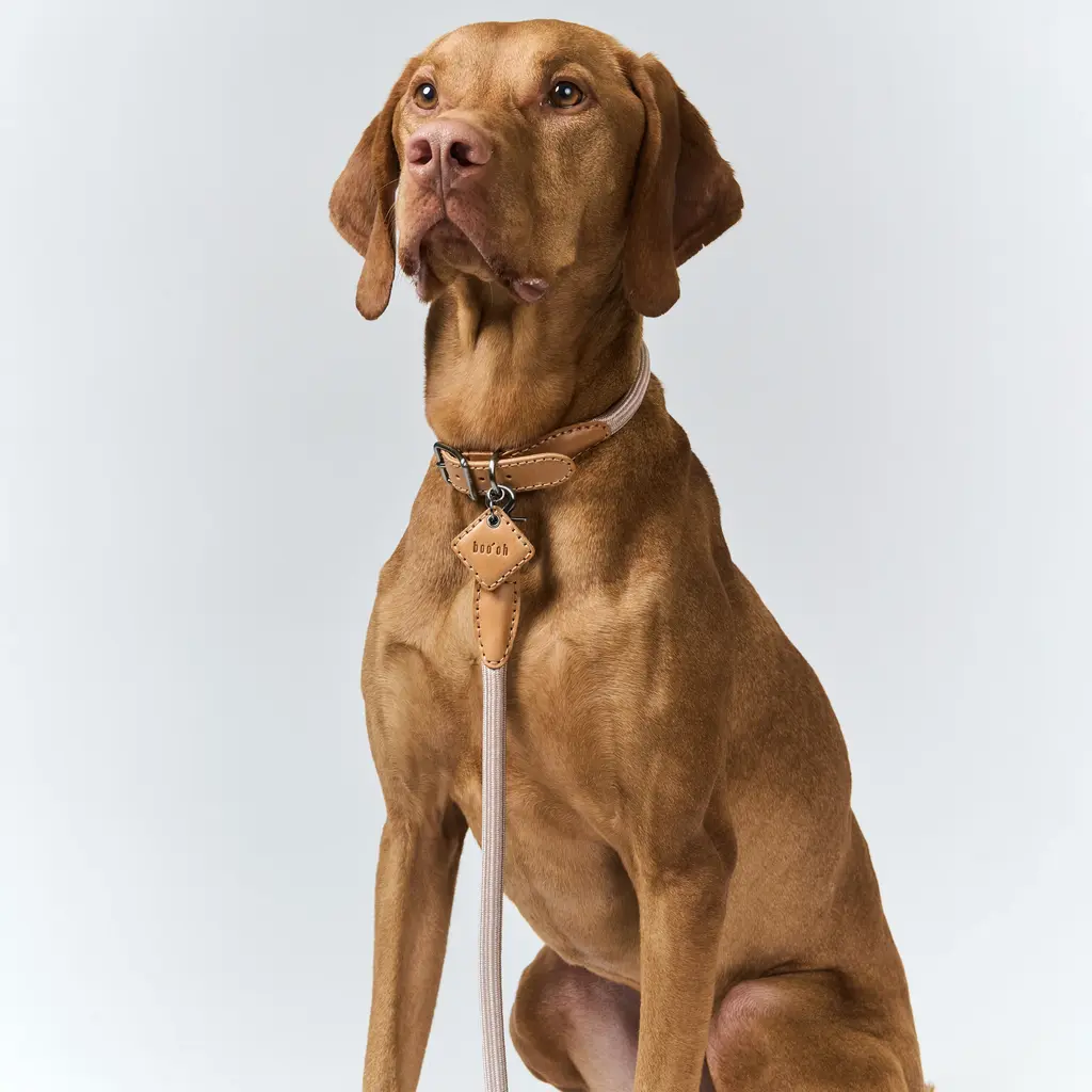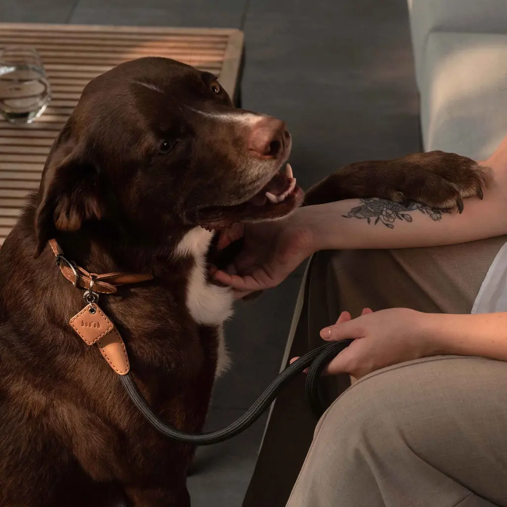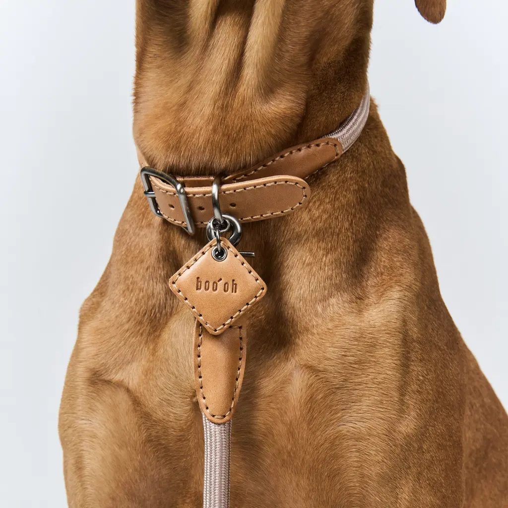 The Ray Collar and Leash Set from Boo'oh Pets combines refined elegance with practical design for your beloved dog. Crafted from premium Italian Buttero leather, known for its soft touch and timeless appeal, both collar and leash are enhanced with a custom rayon silk rope for added comfort and style. The collar offers innovative ID tag options: a modern QR code tag for secure, scannable access to your pet’s information or a classic engraved tag with personalized details. This set ensures your dog looks sophisticated while staying safe and easily identifiable. Highlights