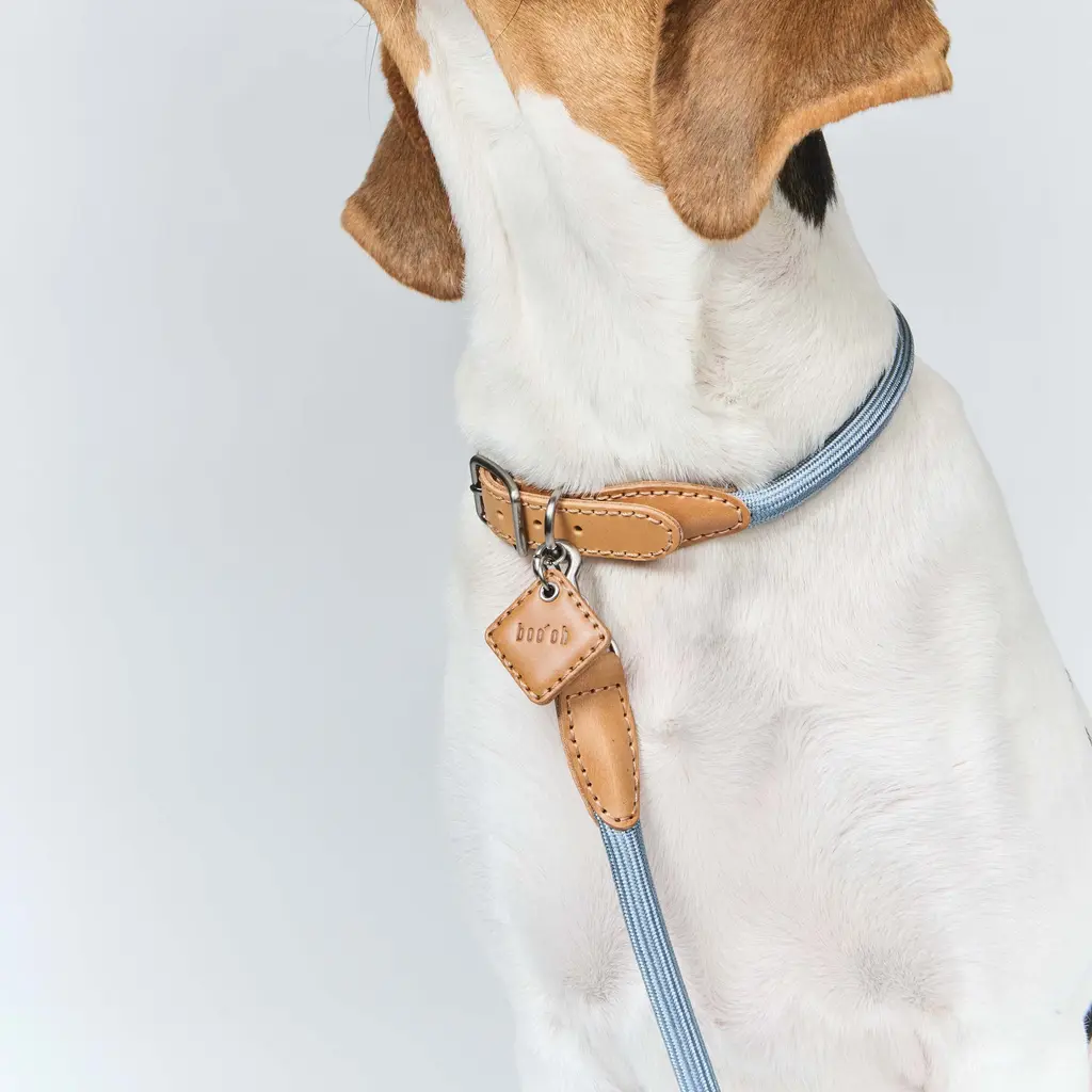 The Ray Collar and Leash Set from Boo'oh Pets combines refined elegance with practical design for your beloved dog. Crafted from premium Italian Buttero leather, known for its soft touch and timeless appeal, both collar and leash are enhanced with a custom rayon silk rope for added comfort and style. The collar offers innovative ID tag options: a modern QR code tag for secure, scannable access to your pet’s information or a classic engraved tag with personalized details. This set ensures your dog looks sophisticated while staying safe and easily identifiable. Highlights