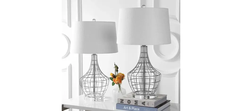 This contemporary Rayden Table Lamp adds modern industrial chic to any room. Its open metal bird cage body is finished in silver and topped with a complementary off white cotton shade for a polished look.