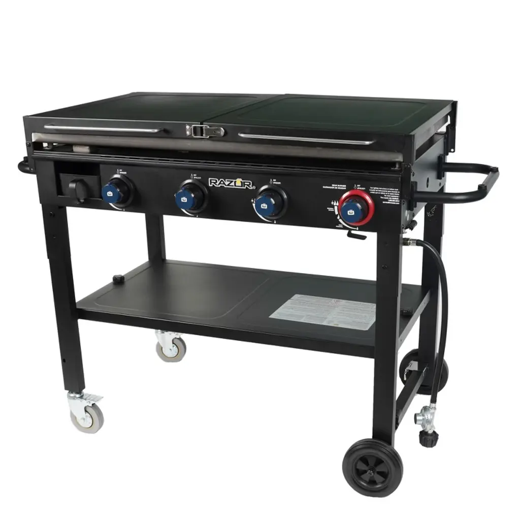Razor Griddle 37 Inch Outdoor Steel 4 Burner Propane Gas Grill Griddle With Wheels And Top Cover Lid Folding Shelves For Home Bbq Cooking, Black