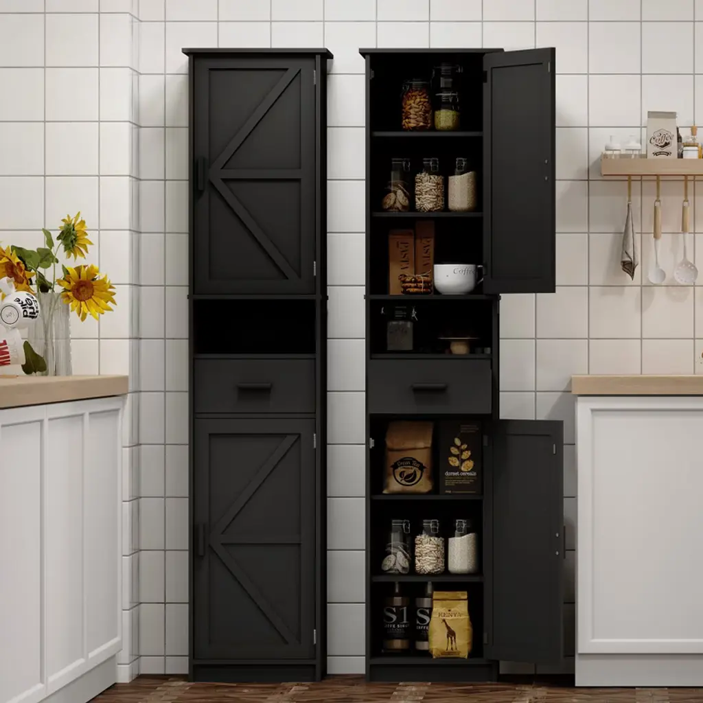This slim tall cabinet is a smart storage solution designed to efficiently utilize small spaces. Its compact size allows it to fit easily into tight corners, making it an ideal choice for small urban apartments. It cleverly combines open and closed storage, offering multiple compartments with two doors and a drawer. The upper compartment is perfect for small items like beauty products, while the sturdy lower compartment securely stores heavy items and miscellaneous items. Constructed from high-quality particleboard, it offers a stable and durable structure, while four solid wood feet and an anti-tip feature ensure safety. Its versatile design allows it to function not only as a kitchen sideboard but also perfectly adapt to storage needs in the bathroom, living room, and even home office, helping you maximize every inch of space.