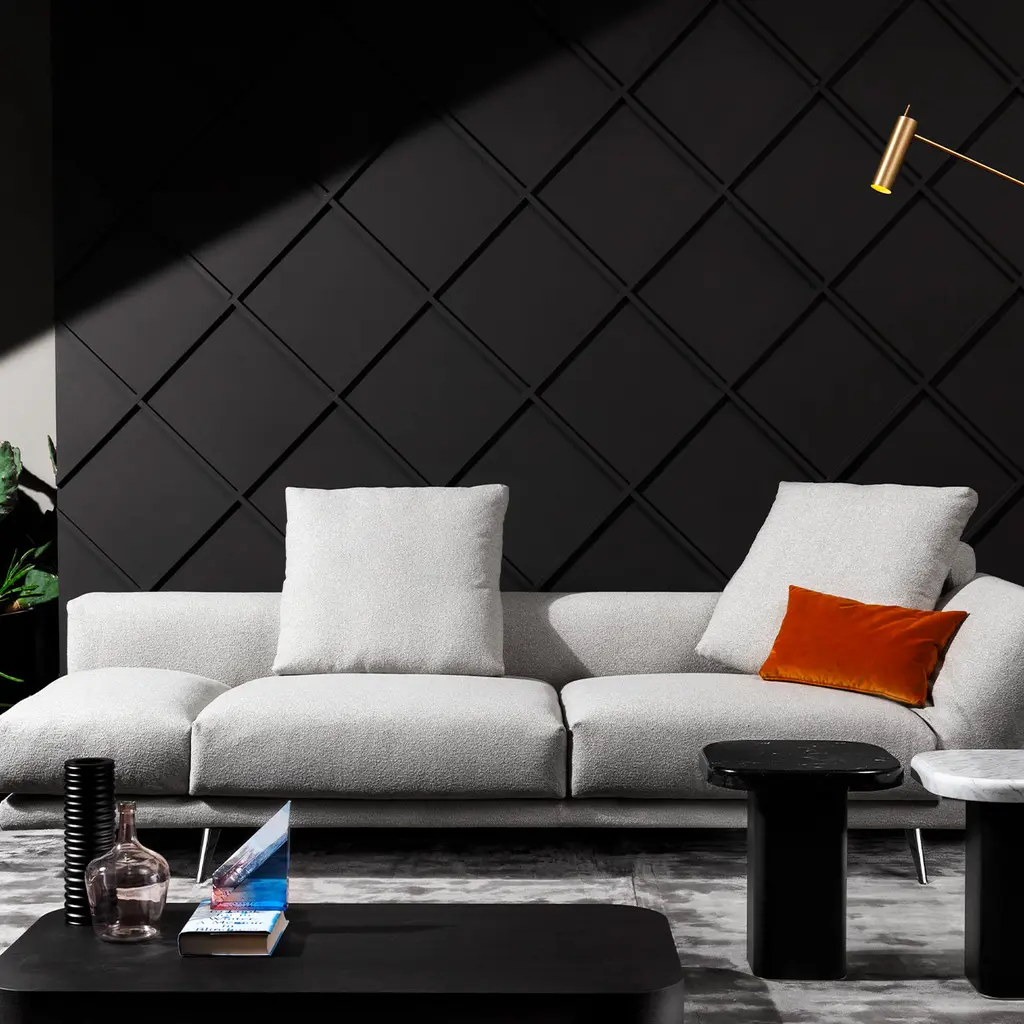 Pure minimalism made inviting by a generous padding percentage, this sofa conceals great functionality that will surprise at every use. The reclining sides make it ideal to serve as a chaise longue or provide ample surfaces for laying one's arms, while the rolls equipping the square back cushions (cm 60x60) increase the overall comfort. Stiletto legs finished in black nickel complete the design, which is available in multiple sizes, fabrics, or leather upon request to the Concierge.