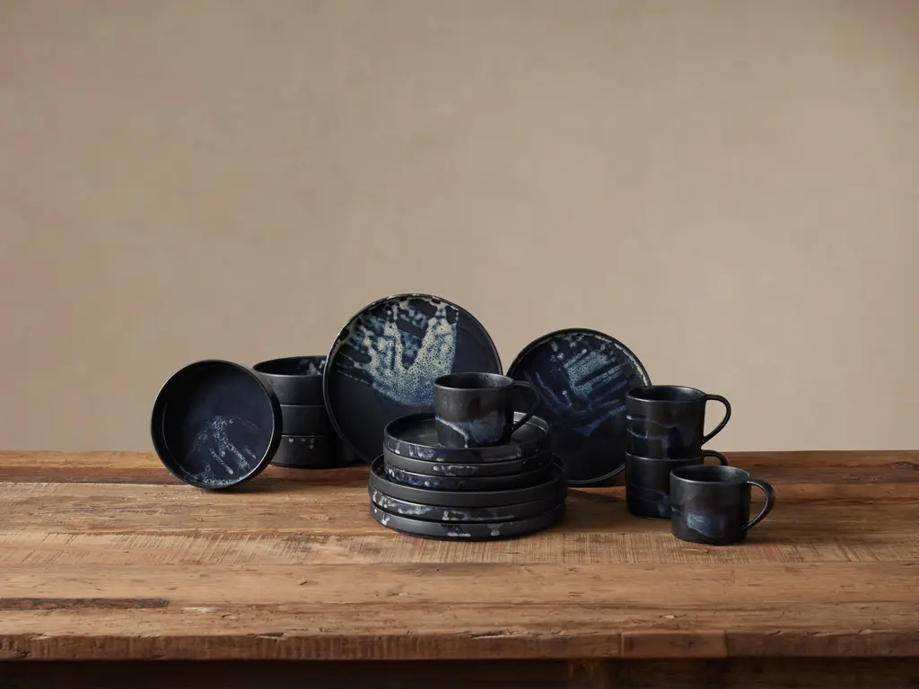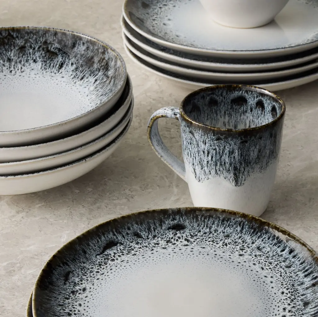 The reactive glaze produces variegated coloring. Its blend of black, white and hints of blue. Available in multiple shapes to suit your style. Easy to pair or mix in with your existing collection.