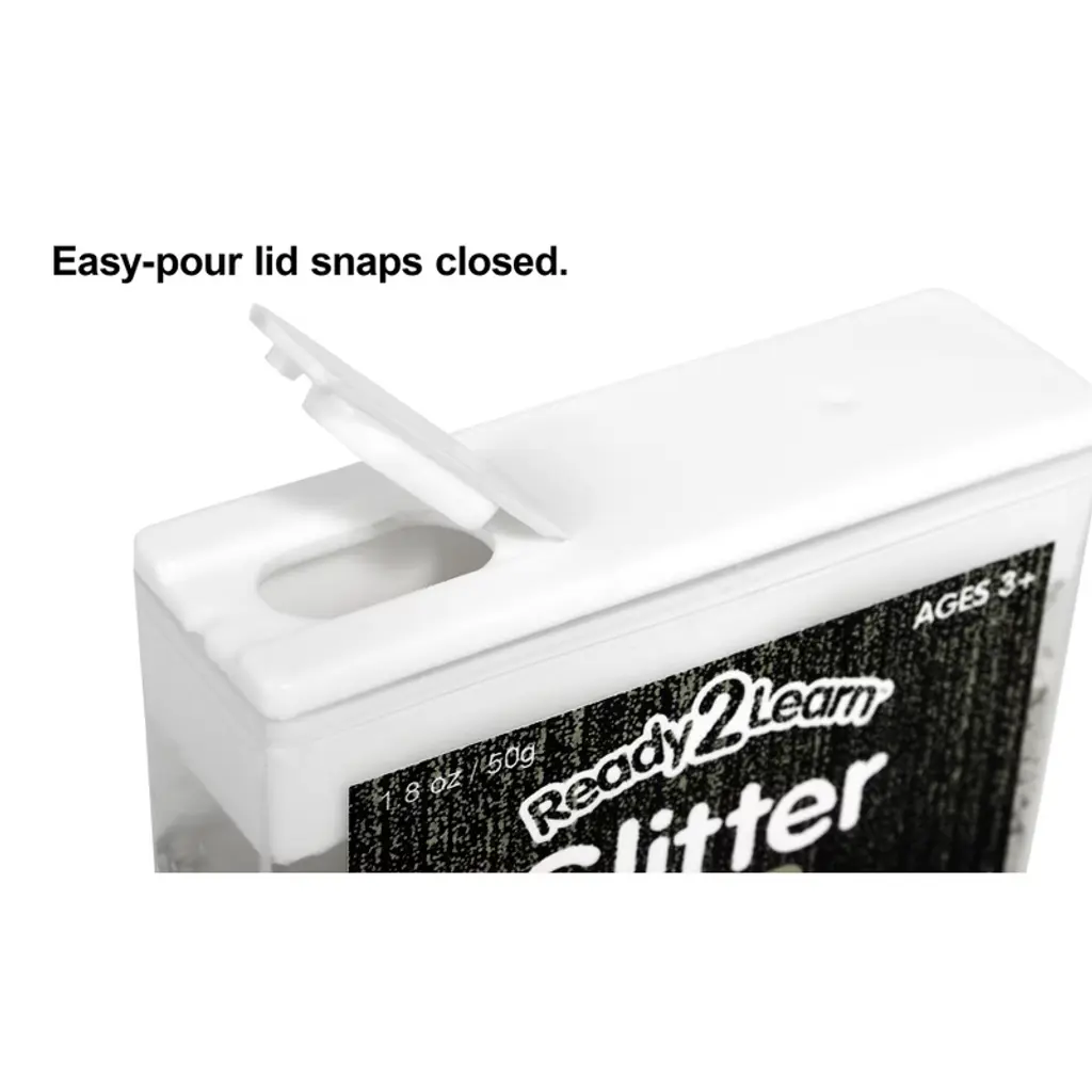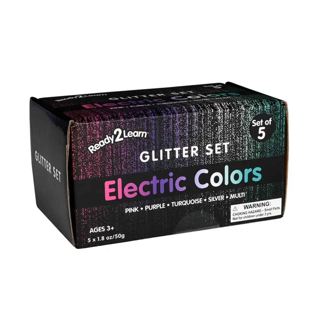 READY 2 LEARN™ Glitter - Electric - Set of 5 | This set includes 5 containers with 1.8 oz of pink, purple, turquoise, silver and multicolor glitter. This shiny, vibrant glitter is the prefect addition to any arts and crafts supply! Adhere glitter to 2D art projects for color and sparkle. Create layered 3D art in jars, bottles, glasses, flower vases, shadowboxes and more. Or, incorporate glitter into a variety of sensory stations and activities. Crafting with glitter contributes to the development of children's fine motor skills, hand-eye coordination and creative expression. The containers feature an easy-pour lid and plastic tray for easy cleanup, storage and travel. This glitter is non-toxic. For ages 3+. Container size: 3.2"L x 3.4"H.