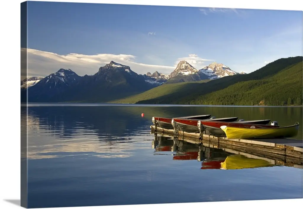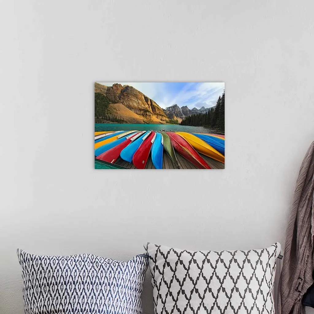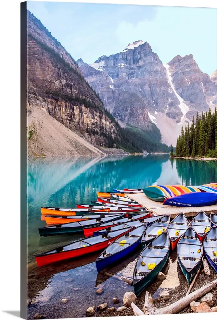 Large, horizontal photograph of colorful boats lined up on a dock at Moraine Lake. The mountains in Banff National Park, in Alberta, Canada in the background.