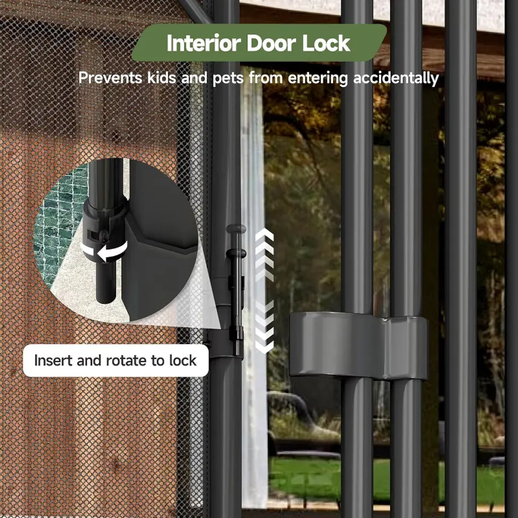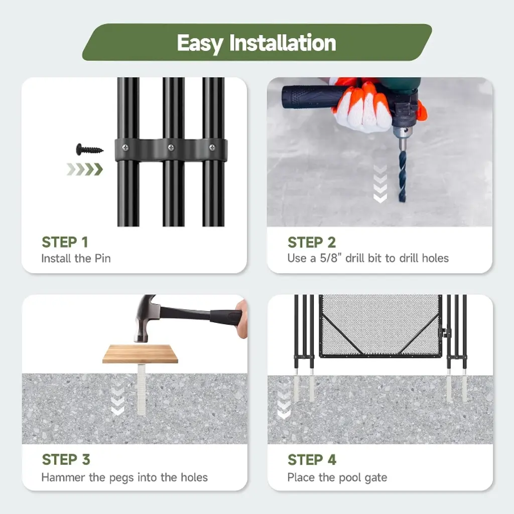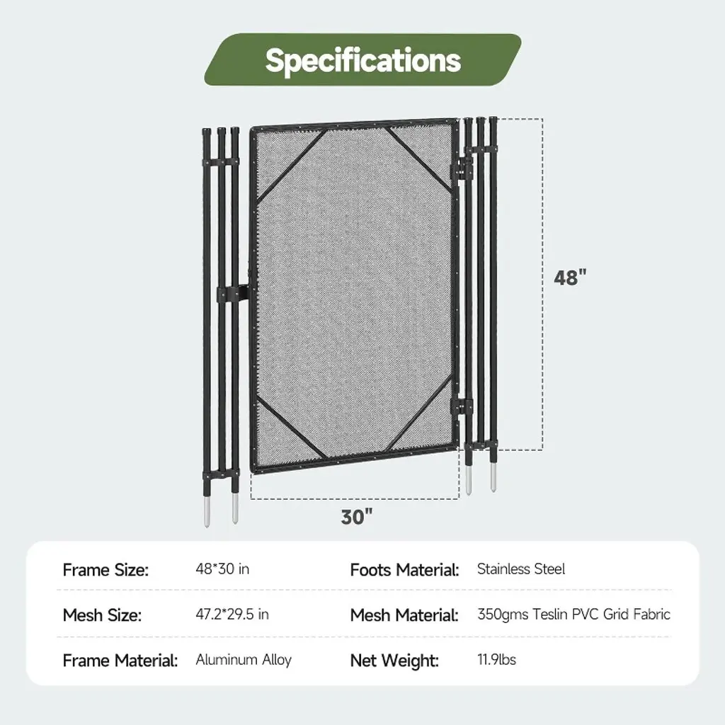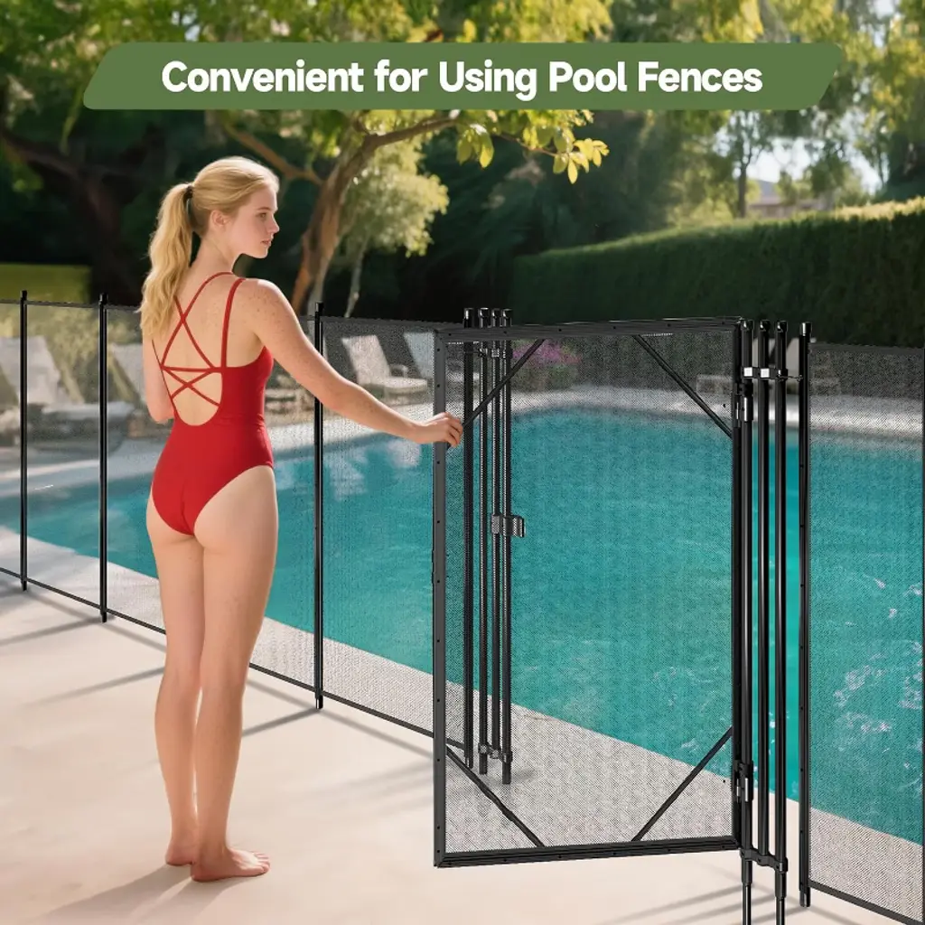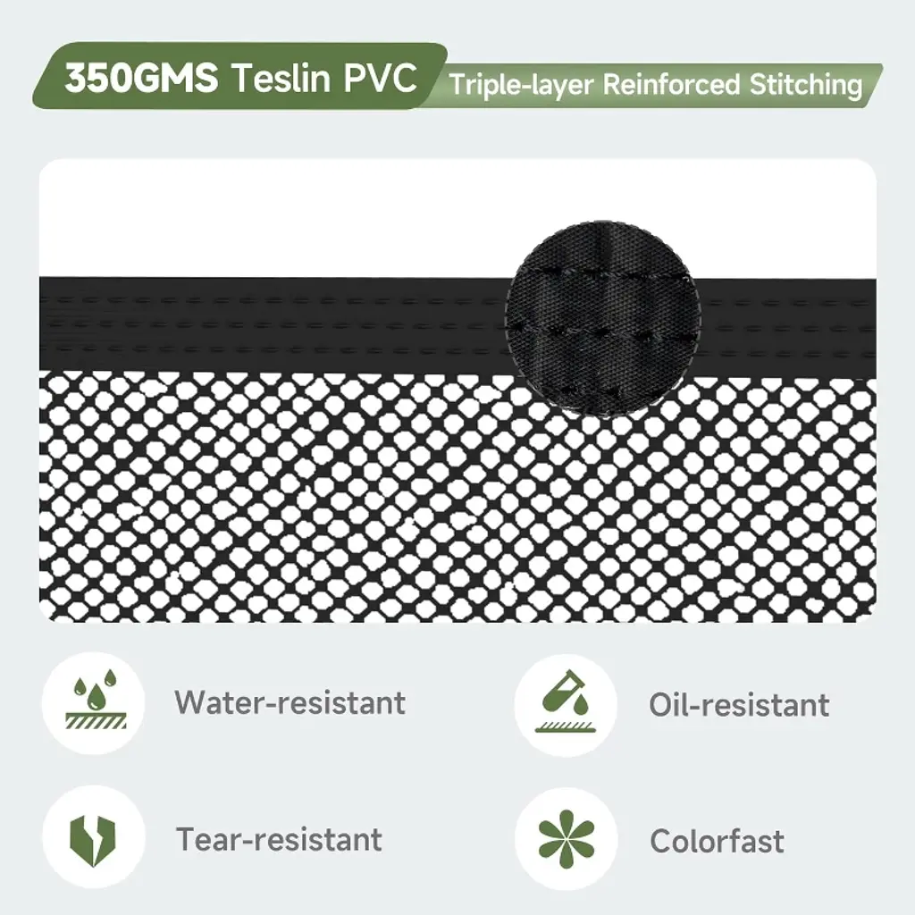 This product is constructed with aluminum tubes and stainless steel support legs, featuring rust-proof edge binding for enhanced durability, making it resistant to corrosion and structural degradation in outdoor conditions. The 350GMS Teslin Mesh fabric is abrasion-, water-, oil-, and UV-resistant with triple-stitched seams for long-lasting use. Pre-assembled components allow quick setup, and the structure can be disassembled into compact 1.2-meter sections for storage. It integrates seamlessly with pool fencing to create a safety barrier, ideal for homes with children and pets, reducing accidental access to hazardous areas. Includes left/right gate posts, pin, peg, peg cover, gate hooks, and a screwdriver.