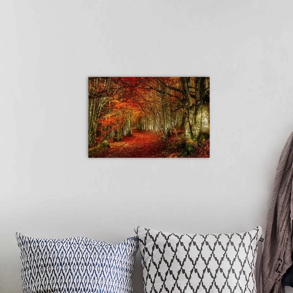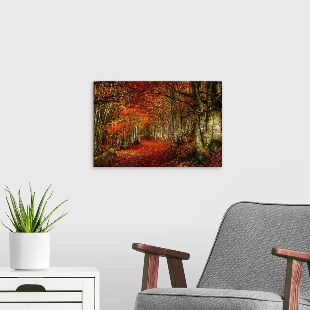 Forest with red and orange fall leaves in the branches and covering the floor, appearing to glow.