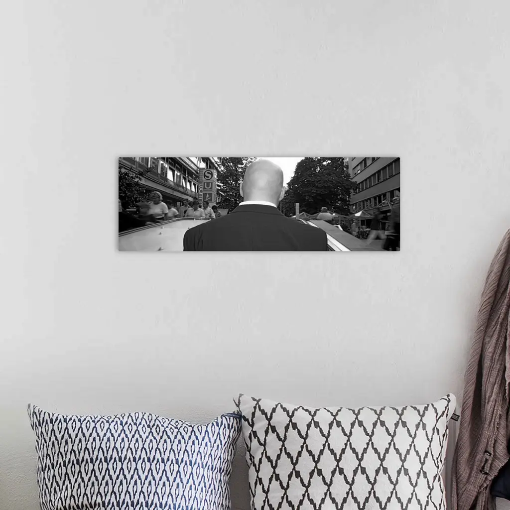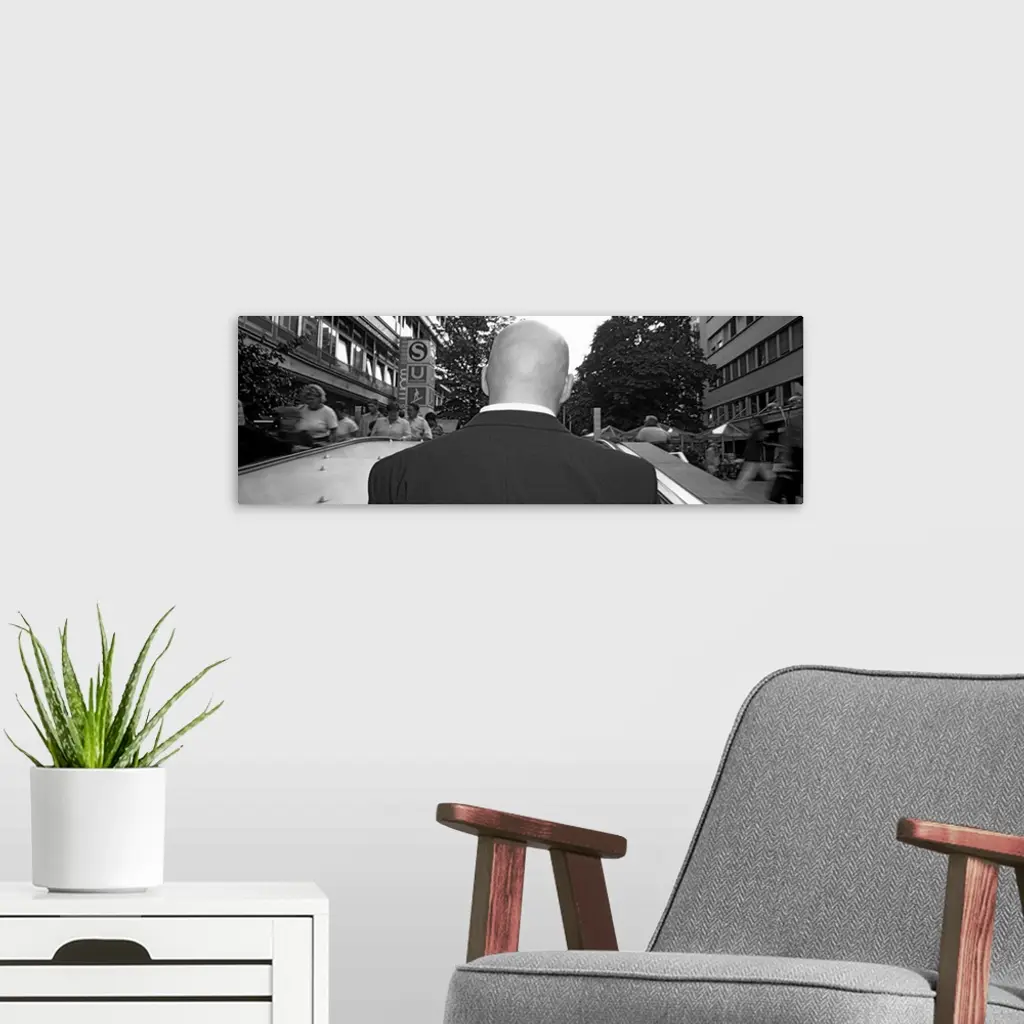 Rear view of a businessman standing on an escalator, Stuttgart, Germany wall art for home and office decor. Discover canvas art prints, photos, mural, big canvas art and framed wall art in GreatBigCanvas.com's varied collections.