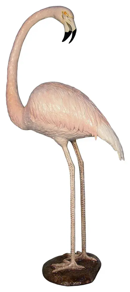 The plastic flamingo is the original design by Don Feathersone with his signature mold in each bird. This flamingo stands 52 inches high and is made in the USA.