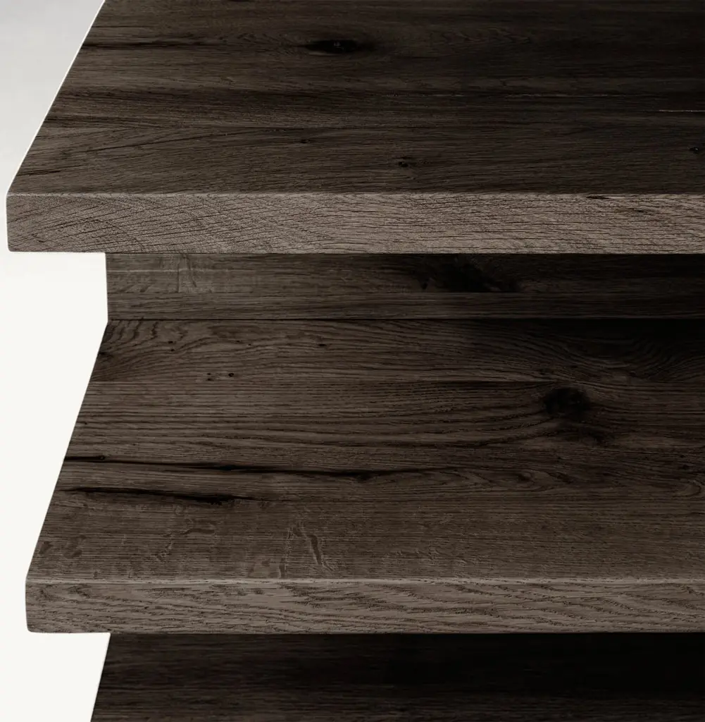 Reclaimed oak timbers from decades-old buildings, with distressed white oak planks for consistency and stability, lend richness to this simple, linear collection from artisan Theo Eichholtz. Each piece is handcrafted of wood that retains its natural character, bearing the occasional knot, nick or crack where no two consoles are exactly the same. SHOP THE ENTIRE COLLECTION