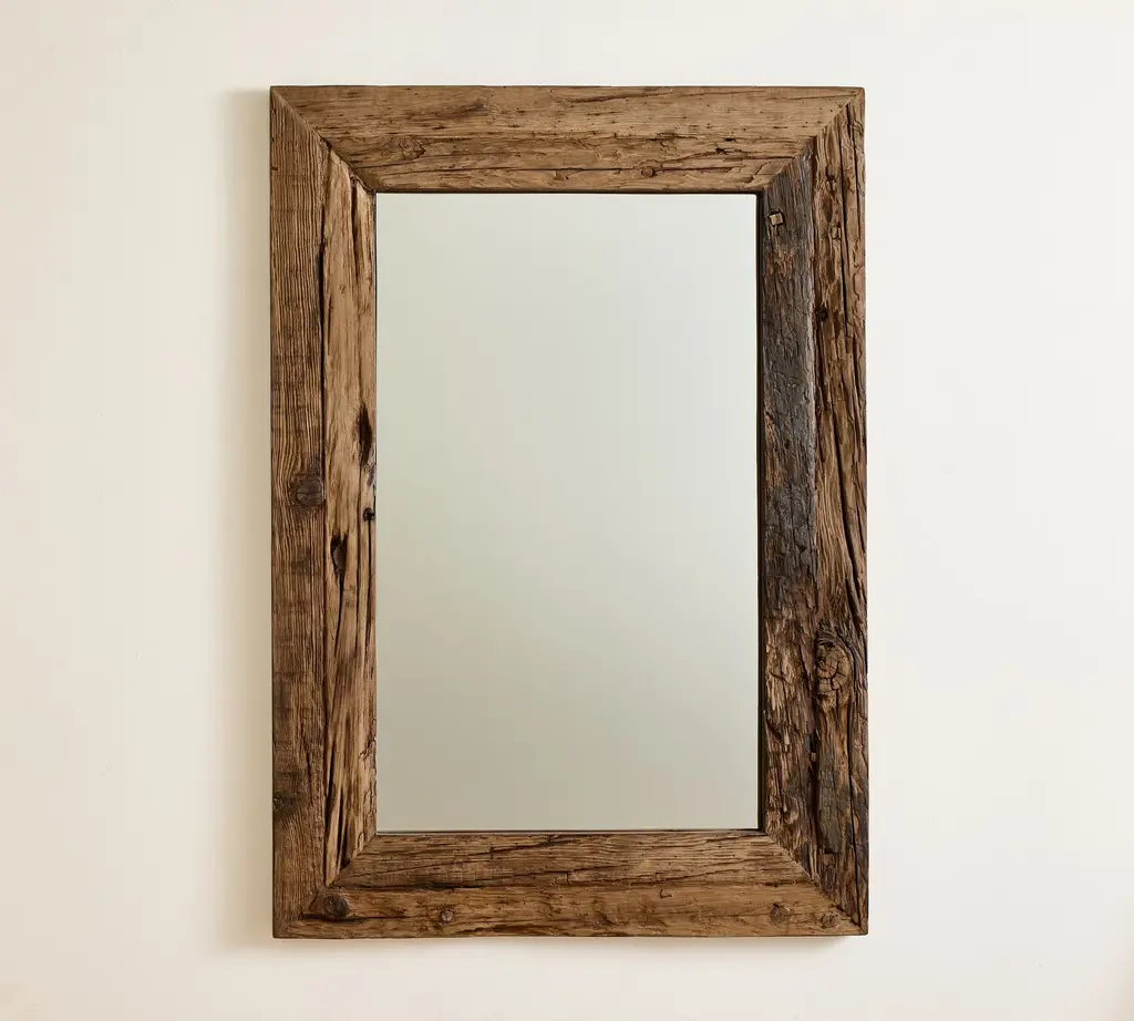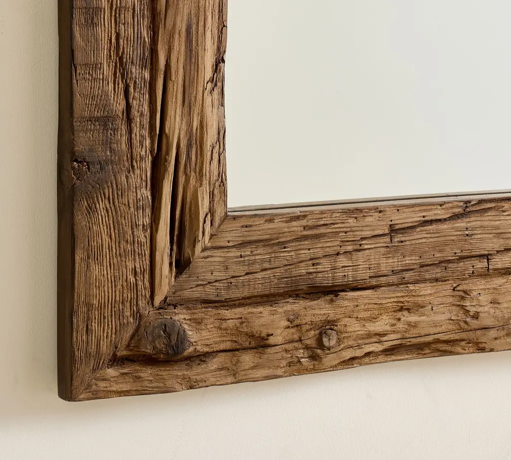 Reclaimed pine has a rustic footprint that makes a calm room cozier, a living room more lodge-like. Choosing wide instead of slender for the frame shape means more room to see the naturally weathered knots and creases that give it one-of-a-kind distinction. A detail we love: it can hang vertically or horizontally to work with your wall’s proportions.