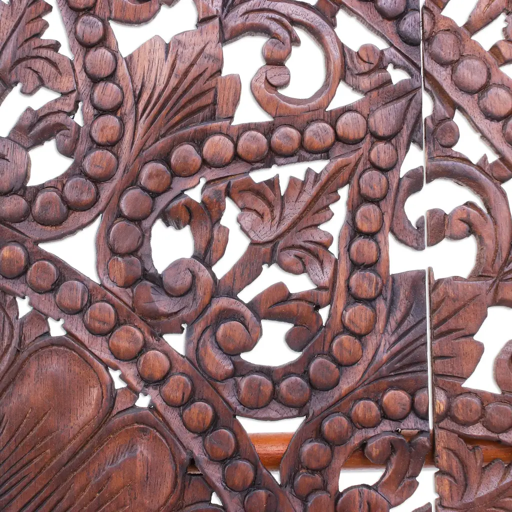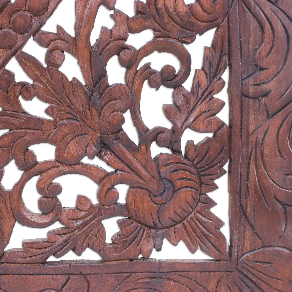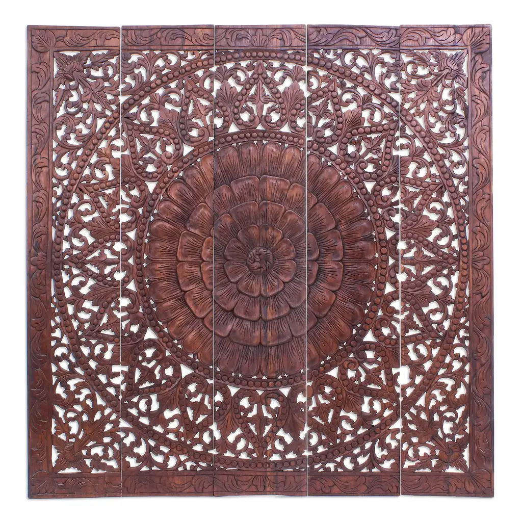 Eve Naewmaung in Thailand designs this set of five lotus-themed relief panels from eco-friendly materials. Thai artisans use reclaimed teak wood to hand carve each panel with a flower and vine pattern that stretches from one end to the other.