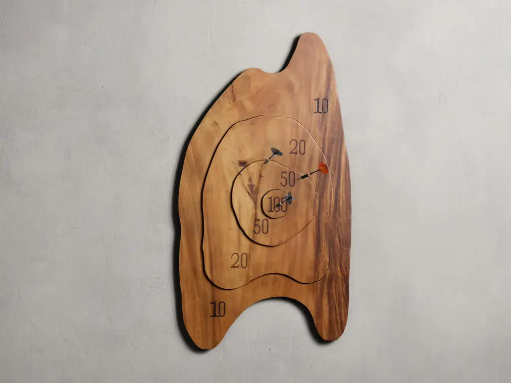 Elevate your family game night with the beauty of natural wood. Our Reclaimed Wood Dart Board is handcrafted by master artisans in Mexico, combining the best of functionality, fun, and sculptural design. Handmade by master craftsman; no two boards are exactly alike. Set of darts included. Hangs from two keyhole openings. Hanging hardware is included and suitable for most walls, but please evaluate your wall type before installing.
