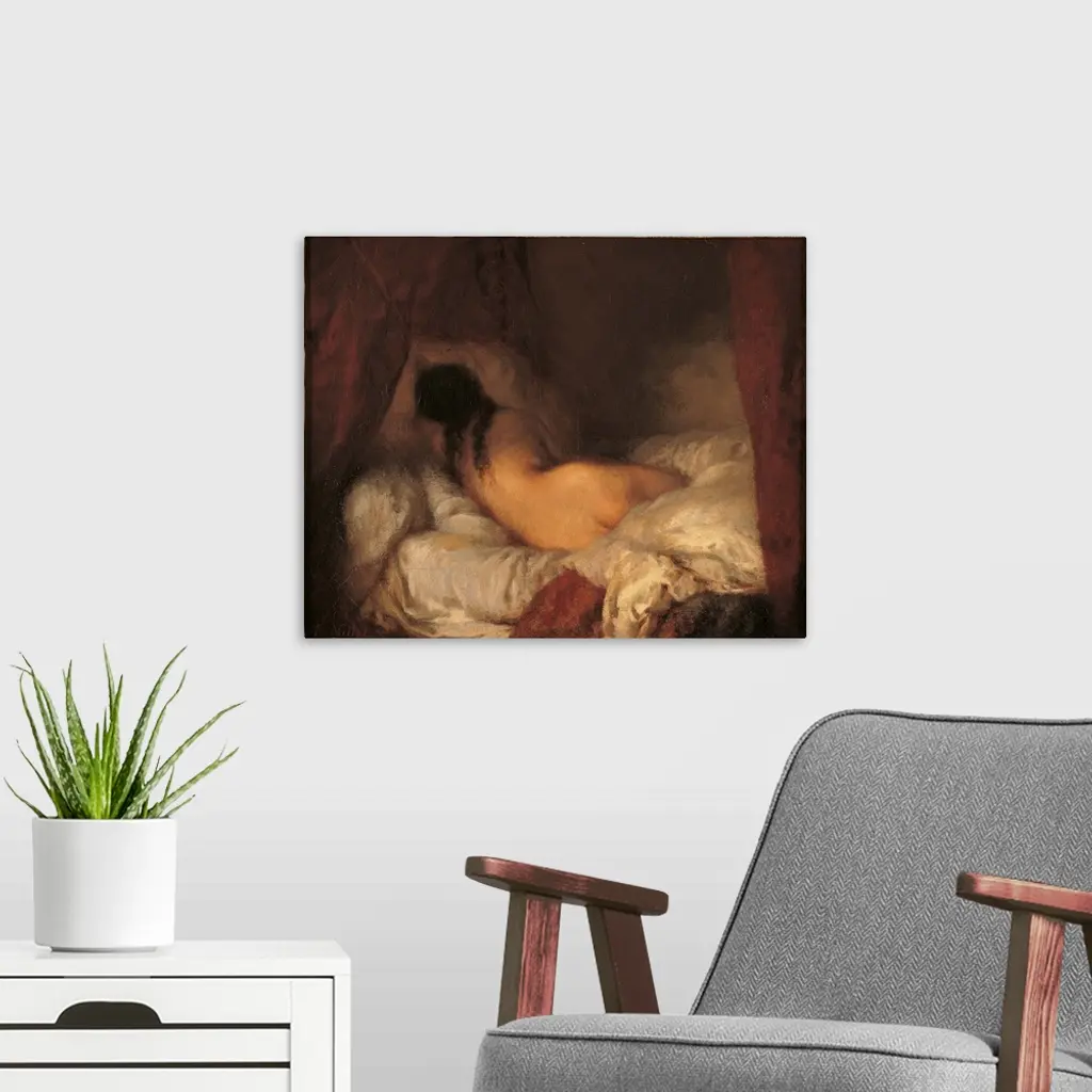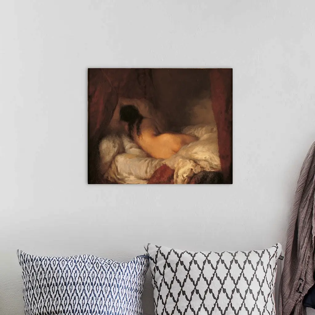 Reclining Female Nude, by Jean-Franois Millet, 1844 - 1845, 19th Century, oil on canvas, cm 33 x 41 - France, Ile de France, Paris, Muse dOrsay, RF2049. All. Young woman room bed blanket pillow sheet curtain red white back. (273051) Everett Collection\Mon
