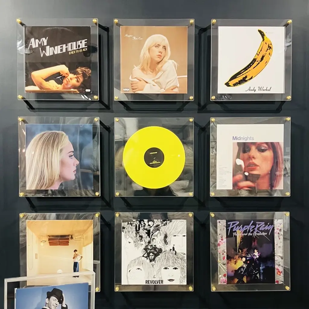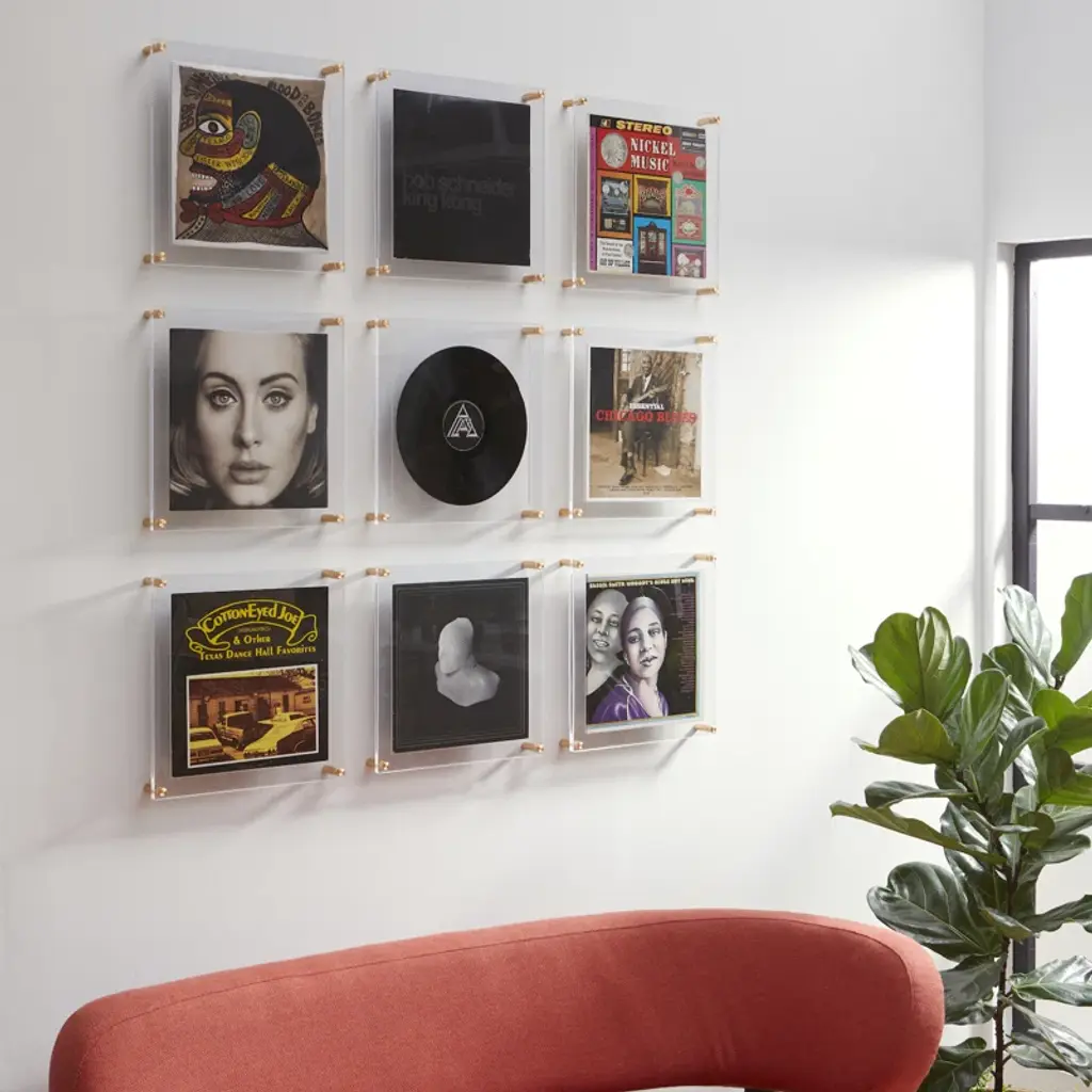 This 15x15" acrylic double-panel Record Frame includes a special "mat" to showcase your carefully curated LP collection. Gold hardware holds your record frame on the wall.