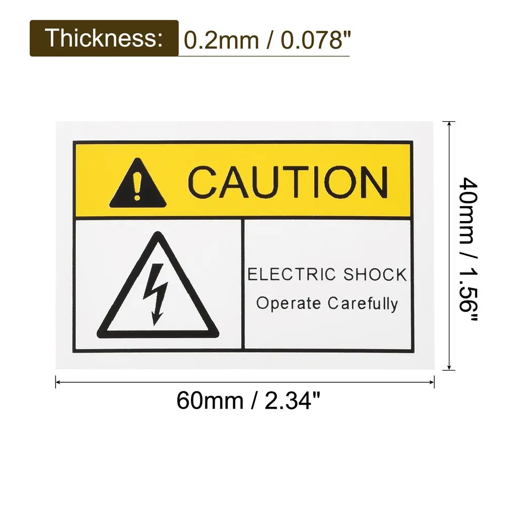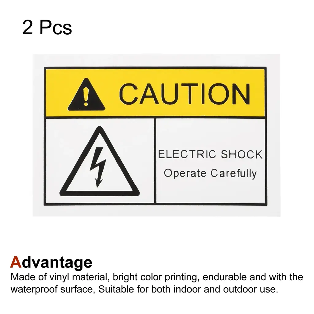 What is this?Small-sized electrical shock hazard risk warning sign to indicate the danger of electric shock,with words "caution,electric shock operation carefully"What will I get?Size:60 x 40mm/2.34 x 1.56inch;Thickness: 0.2mm/0.078inch;pack of 2Is there any advantages of the product?Made of vinyl material, bright color printing, endurable and with waterproof surface, Suitable for both indoor and outdoor useHow to use it?Self-adhesive, easy to use, just peel and stickWhat should I notice?Due to the light problem, there is a slight color difference in the picture shooting