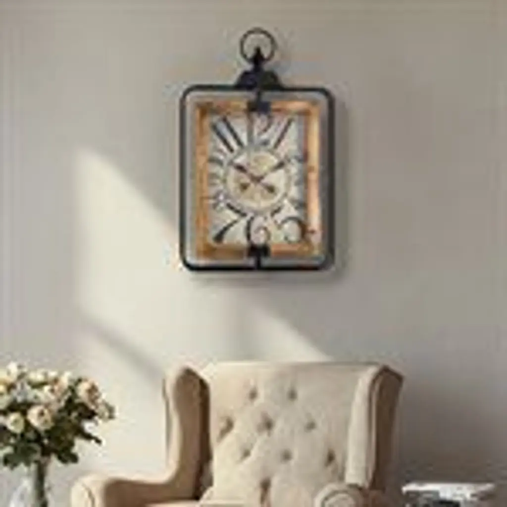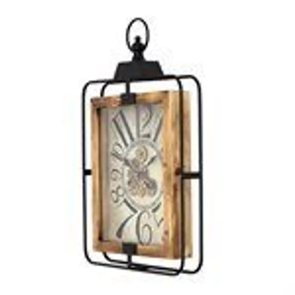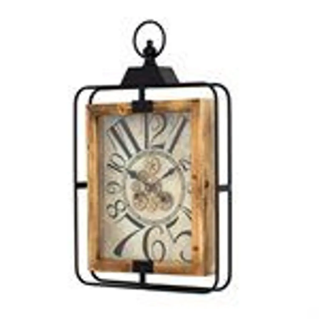 Rectangle Gear Clock. This Rectangle Gear Clock features traditional black numbers on a weathered beige face with functional moving gears. The clock combines wood and metal elements in a rectangular design. No particle board. Fully assembled. Manufacturer: Yosemite Home Decor.