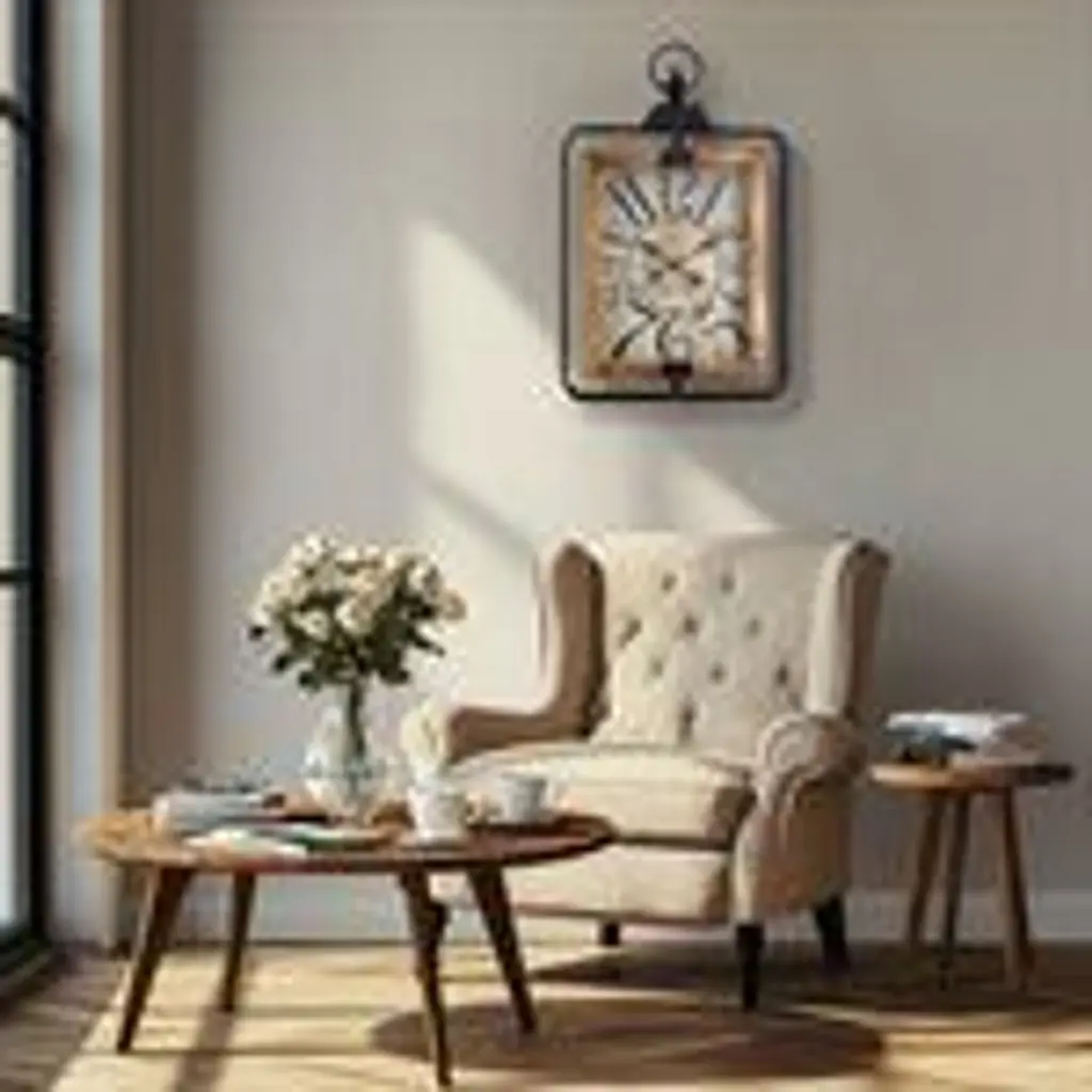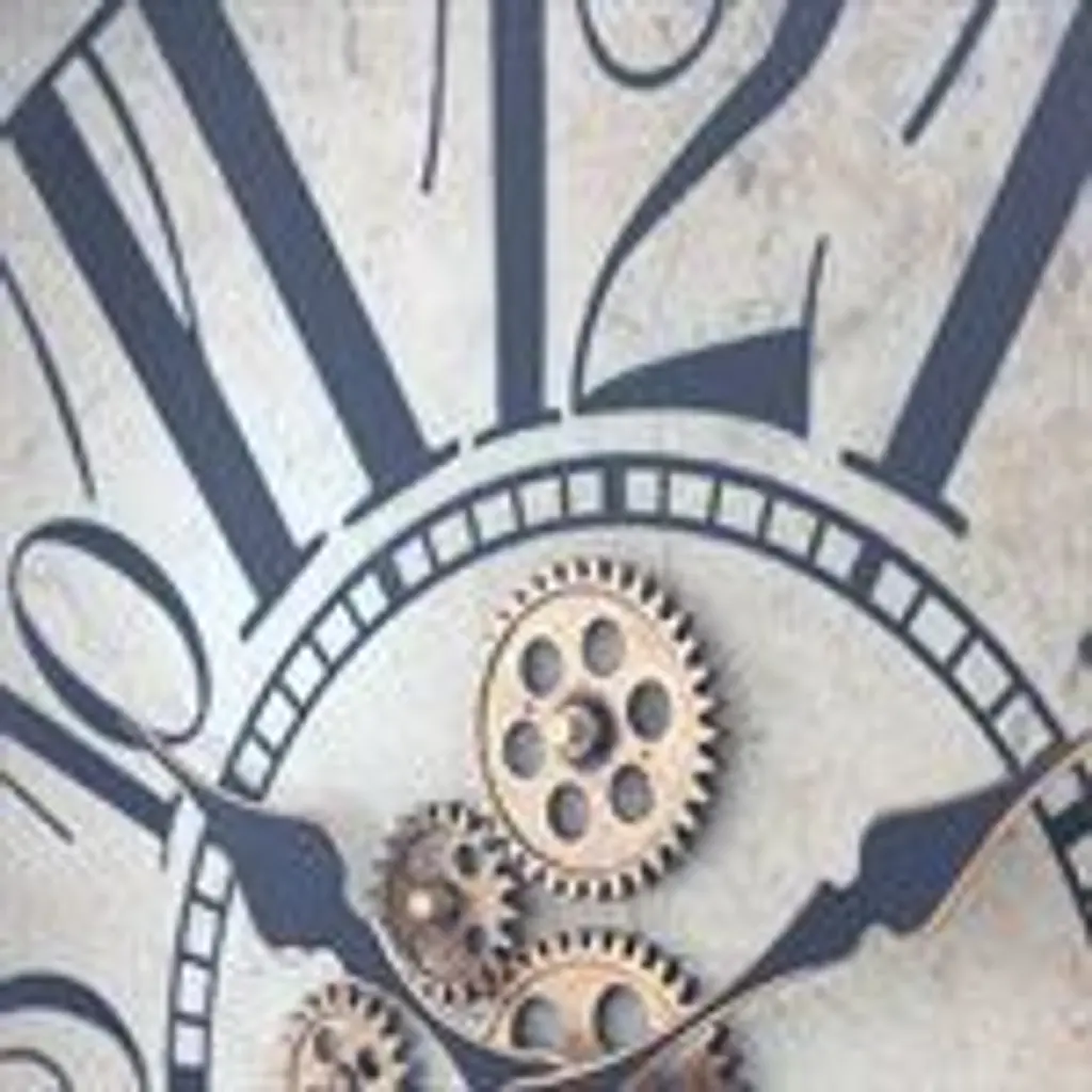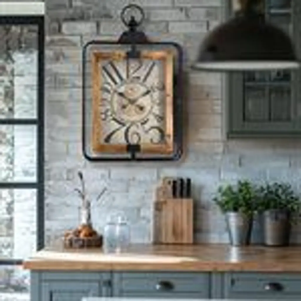 Rectangle Gear Clock. This Rectangle Gear Clock features traditional black numbers on a weathered beige face with functional moving gears. The clock combines wood and metal elements in a rectangular design. No particle board. Fully assembled. Manufacturer: Yosemite Home Decor.